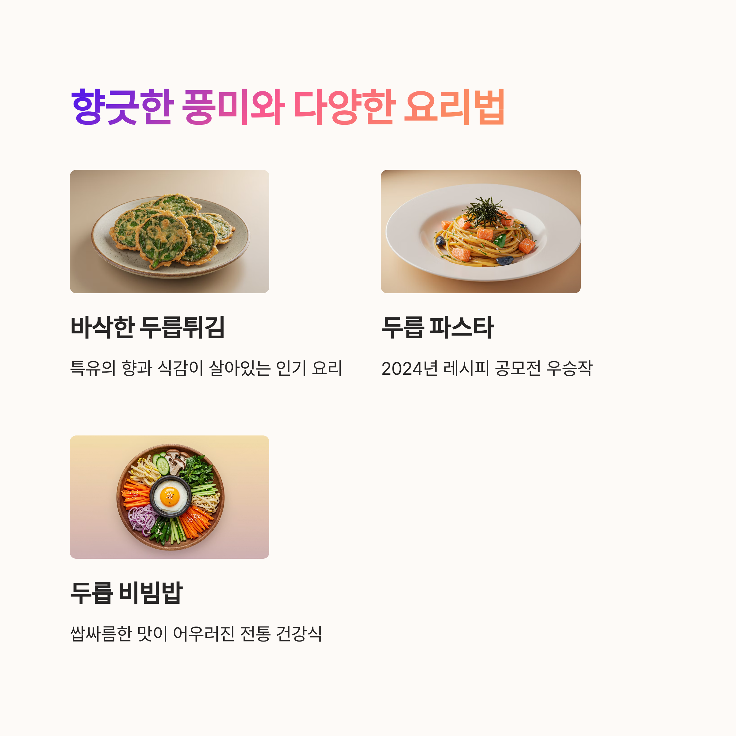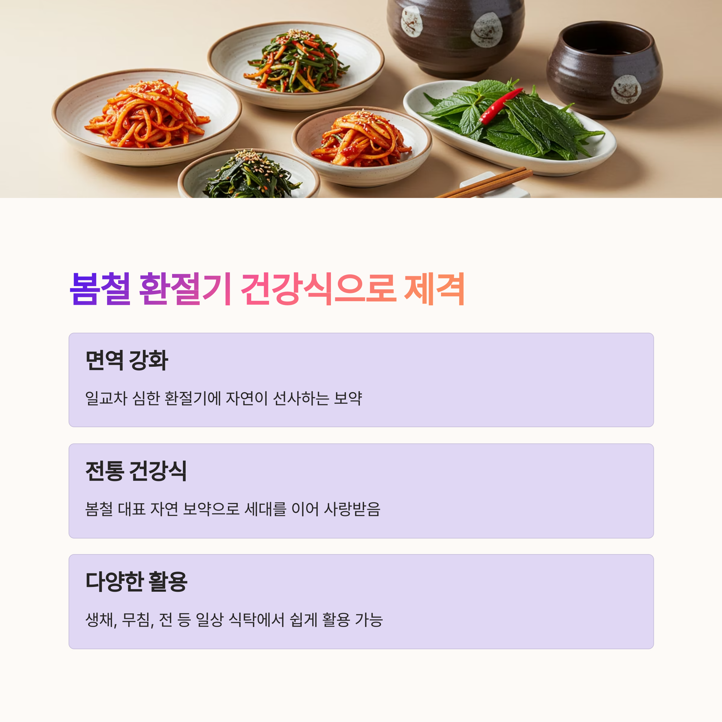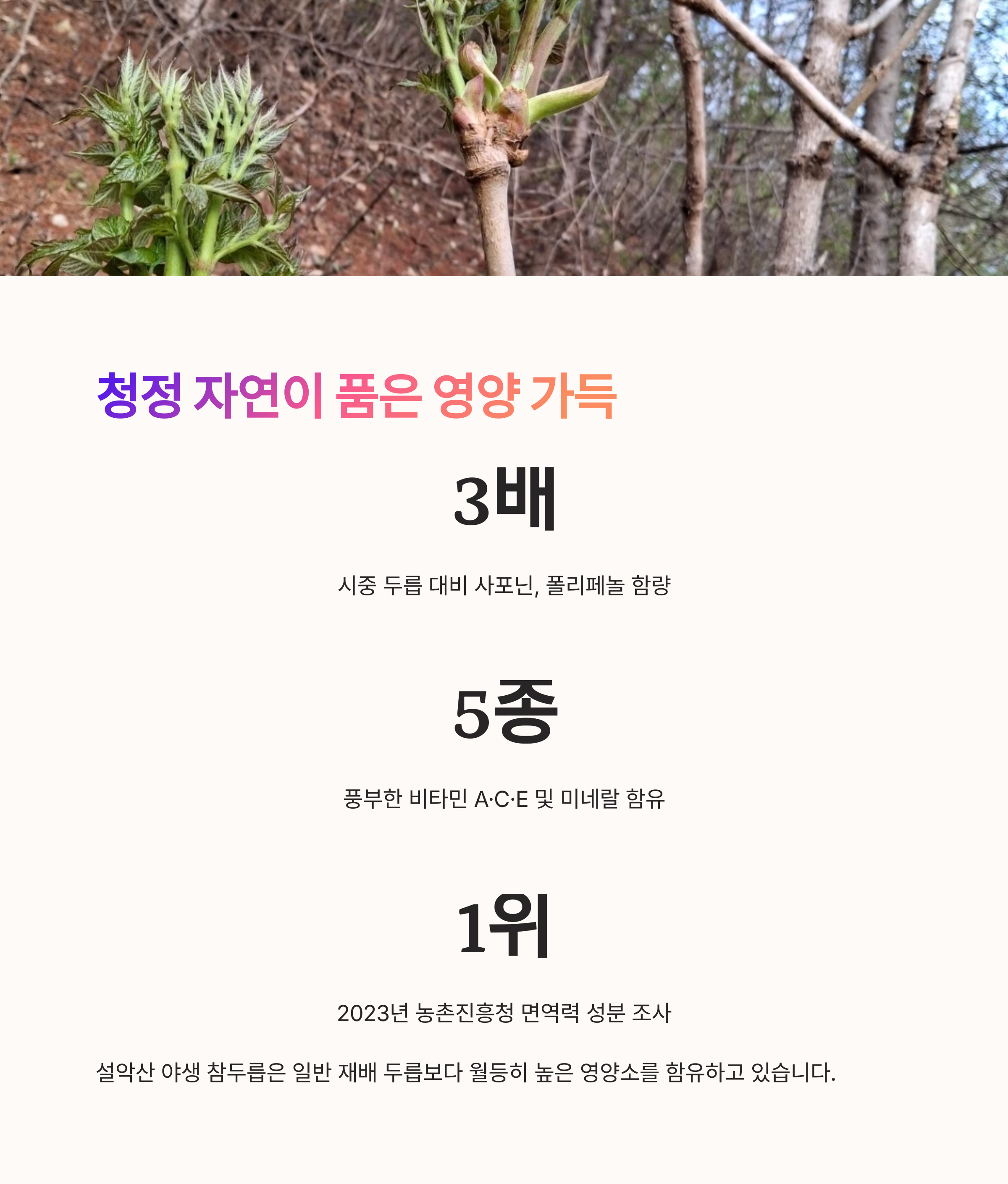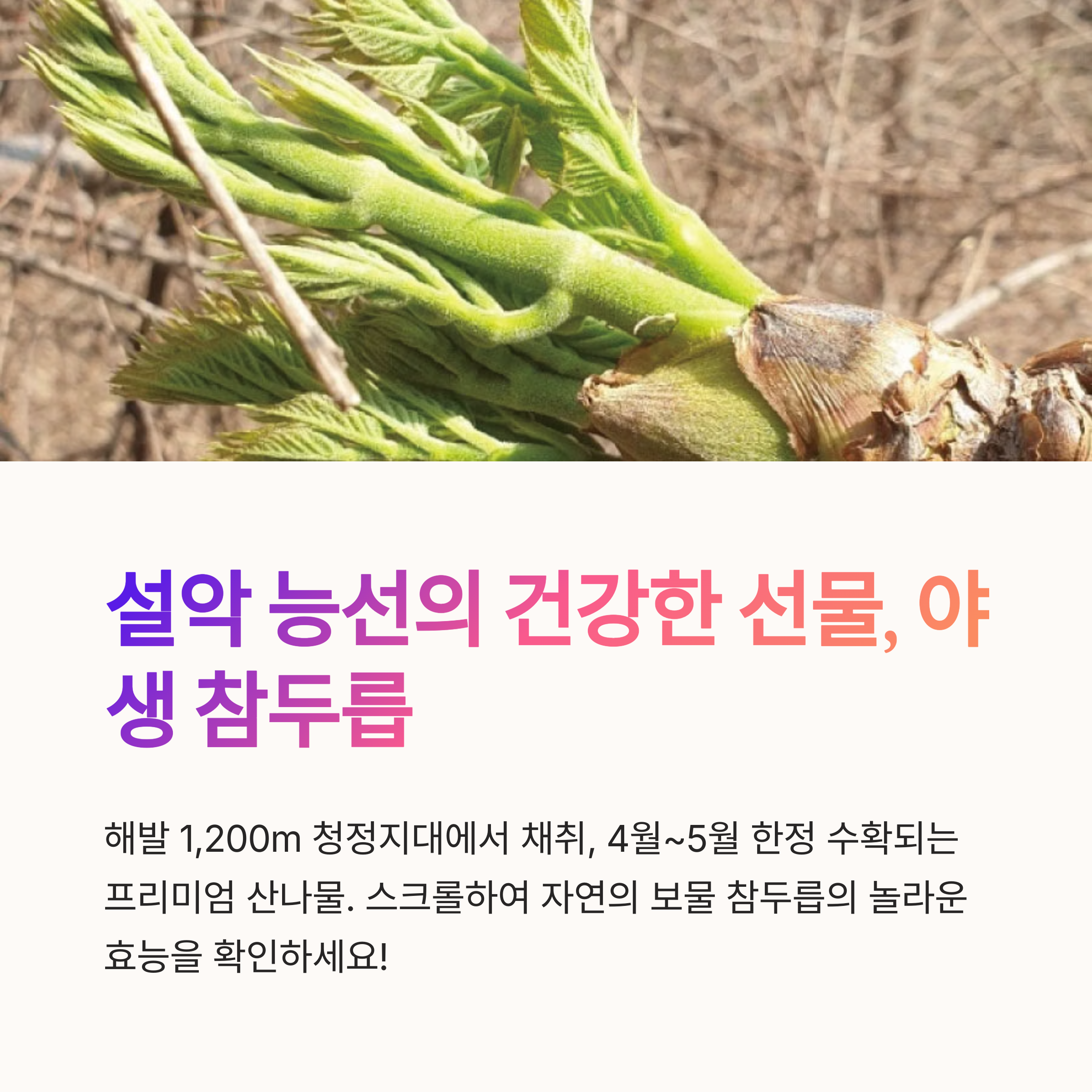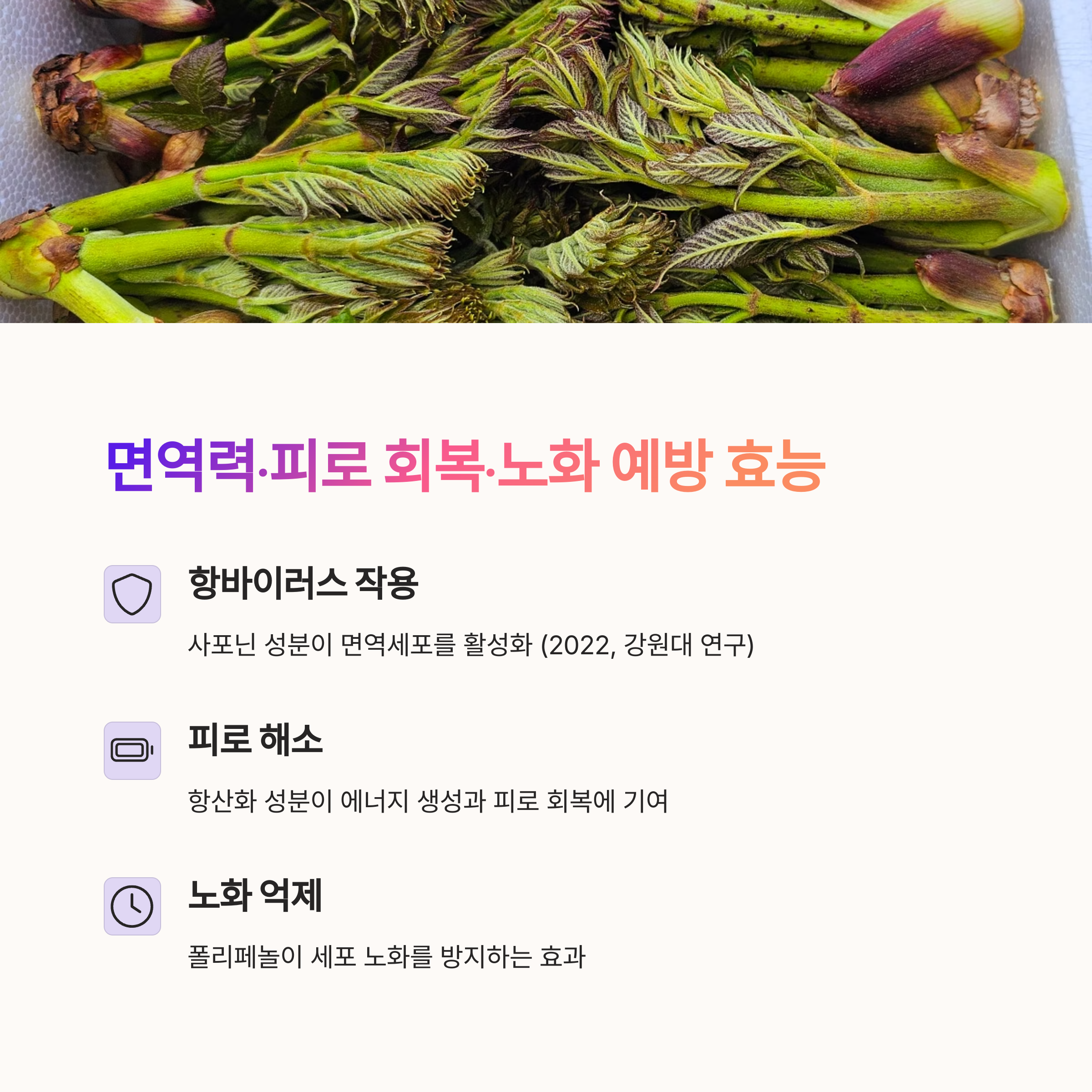 | 봄철 짧은 기간에만 채취 가능한 귀한 산나물 | 면역력 향상에 도움 주는 주요 성분 | 청정 자연에서 채취된 건강한 먹거리 |