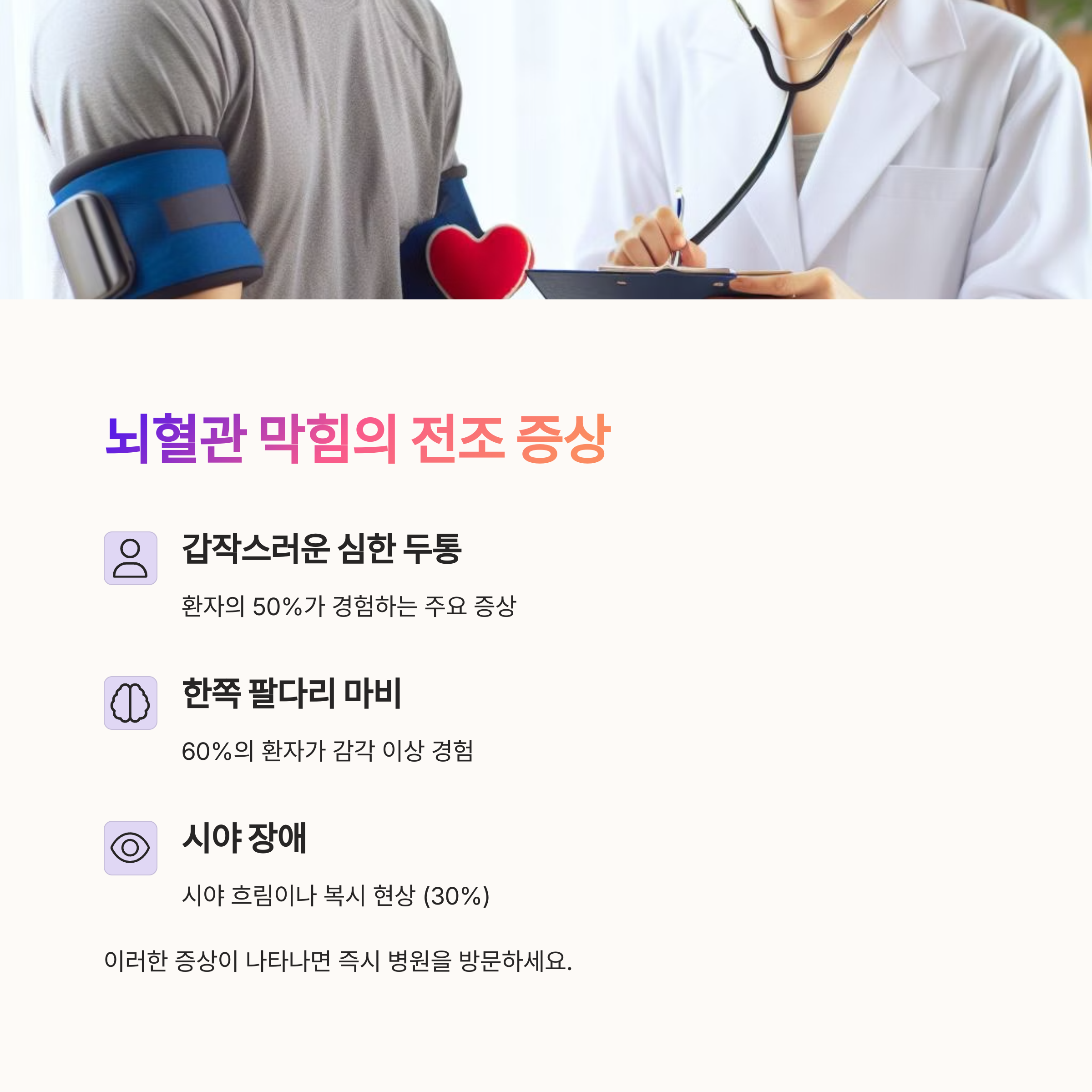 건강한 삶을 유지하는 데 있어 가장 중요한 것 중 하나는 바로 우리 몸이 보내는 신호를 놓치지 않는 것입니다. 특히 뇌혈관 질환은 빠르게 진행되고, 심각한 후유증이나 사망으로 이어질 수 있기 때문에 그 전조 증상을 인지하는 것이 무엇보다 중요합니다. 많은 분들이 가슴 통증에 대해 민감하게 반응하지만, 사실 뇌혈관이 막히기 전 나타나는 증상들은 그보다 더 조용하게 다가오기 때문에 평소 꾸준히 관찰하고 이해해야 합니다. 이번 글에서는 뇌졸중이나 뇌경색처럼 치명적인 뇌혈관 막힘 증상의 초기 징후와 우리가 실생활에서 어떻게 예방할 수 있을지에 대해 쉽게 풀어 설명드리려 합니다. 당신의 작은 관심이 소중한 생명을 살릴 수 있습니다. 끝까지 꼼꼼히 읽어보시고, 지금 바로 내 몸 상태를 점검해 보세요.