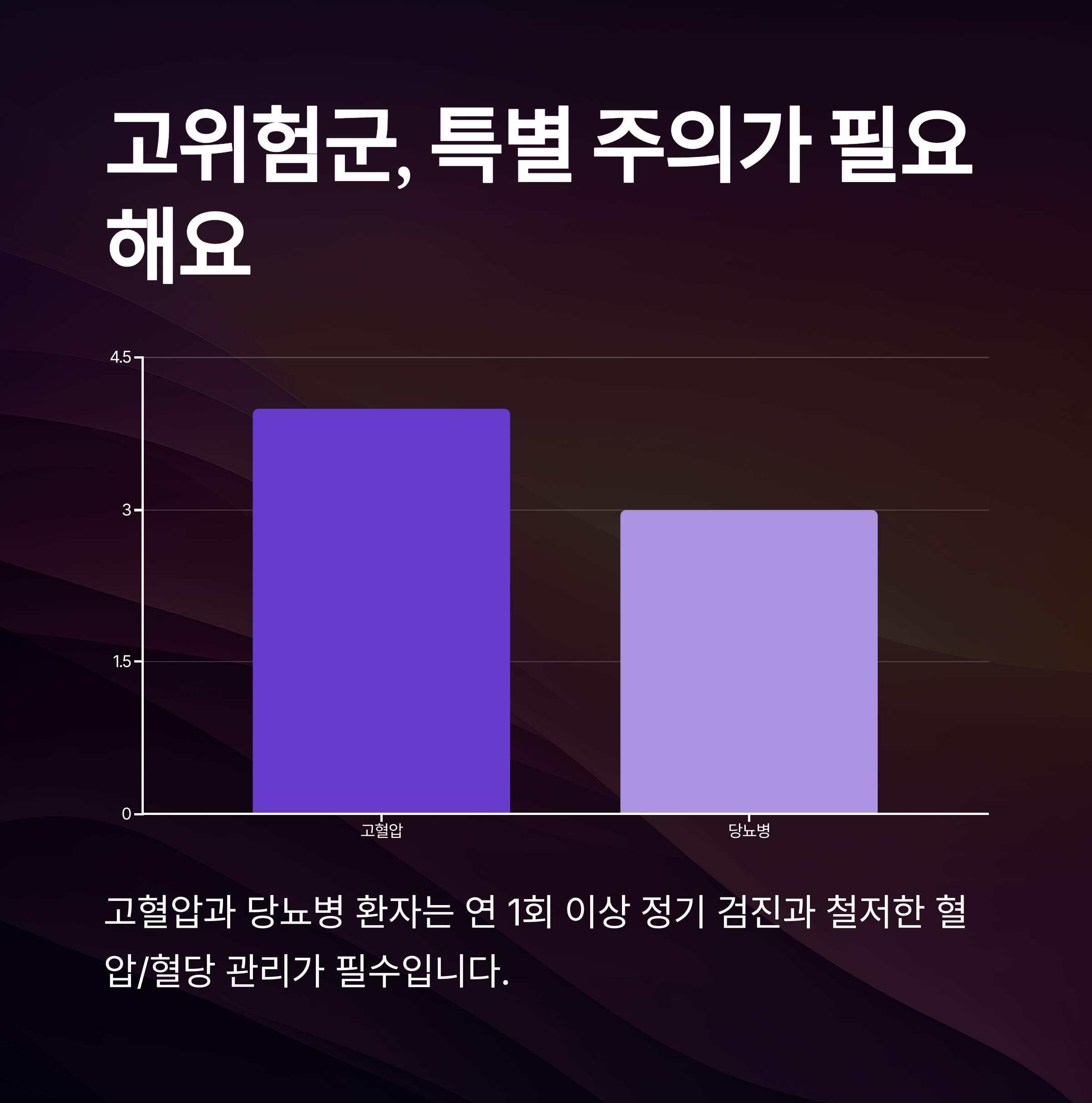 평소 고혈압, 당뇨병, 고지혈증과 같은 만성질환을 앓고 있는 분들은 뇌혈관 질환 발생 가능성이 높기 때문에 특히 더 조심해야 합니다. 이러한 질환은 혈관을 점점 좁게 만들고, 혈류를 제한하여 뇌로 가는 산소 공급에 차질을 빚게 됩니다. 이로 인해 발생하는 혈전이 뇌혈관을 막으면 단시간에 큰 손상을 초래할 수 있습니다. 따라서 정기적인 건강검진과 함께 자신의 평소 혈압, 혈당 수치를 꾸준히 관리하는 습관이 매우 중요합니다. 또한 충분한 수분 섭취, 과도한 스트레스 해소, 규칙적인 수면은 예방에 큰 도움이 됩니다.
