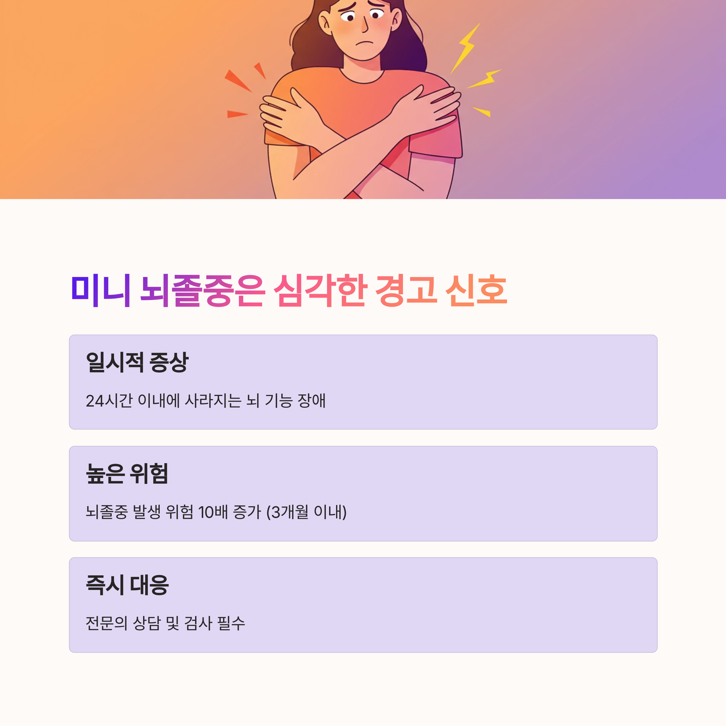 | 갑작스러운 어지러움, 발음이 어눌해짐 | TIA 증상은 짧지만 경고 역할을 합니다 | 정기검진, 수분 섭취, 스트레스 해소가 핵심 |