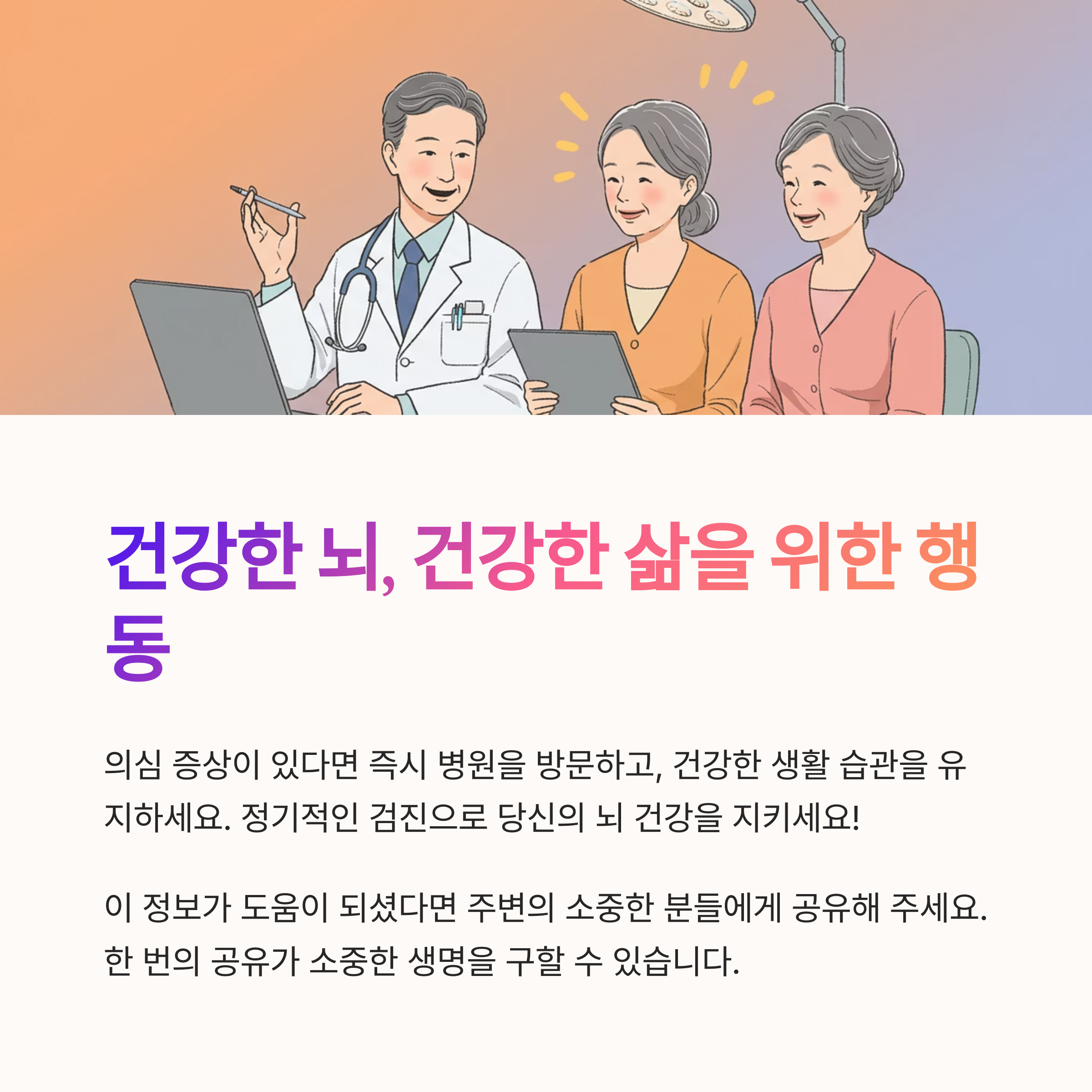 뇌혈관 막힘은 조기에 발견하고 대처한다면 생명을 구할 수 있는 질환입니다. 우리가 흔히 무시할 수 있는 작고 반복적인 증상이 실은 커다란 위험의 신호일 수 있다는 점을 항상 기억해야 합니다. 건강을 위한 노력은 지금 이 순간부터 시작될 수 있으며, 올바른 식습관과 생활 습관을 갖추는 것이 예방의 핵심입니다. 지금 내 몸이 보내는 신호에 귀 기울여 보세요. 정기적인 검진과 건강한 습관으로 더 오래, 더 건강하게 살아갈 수 있습니다.