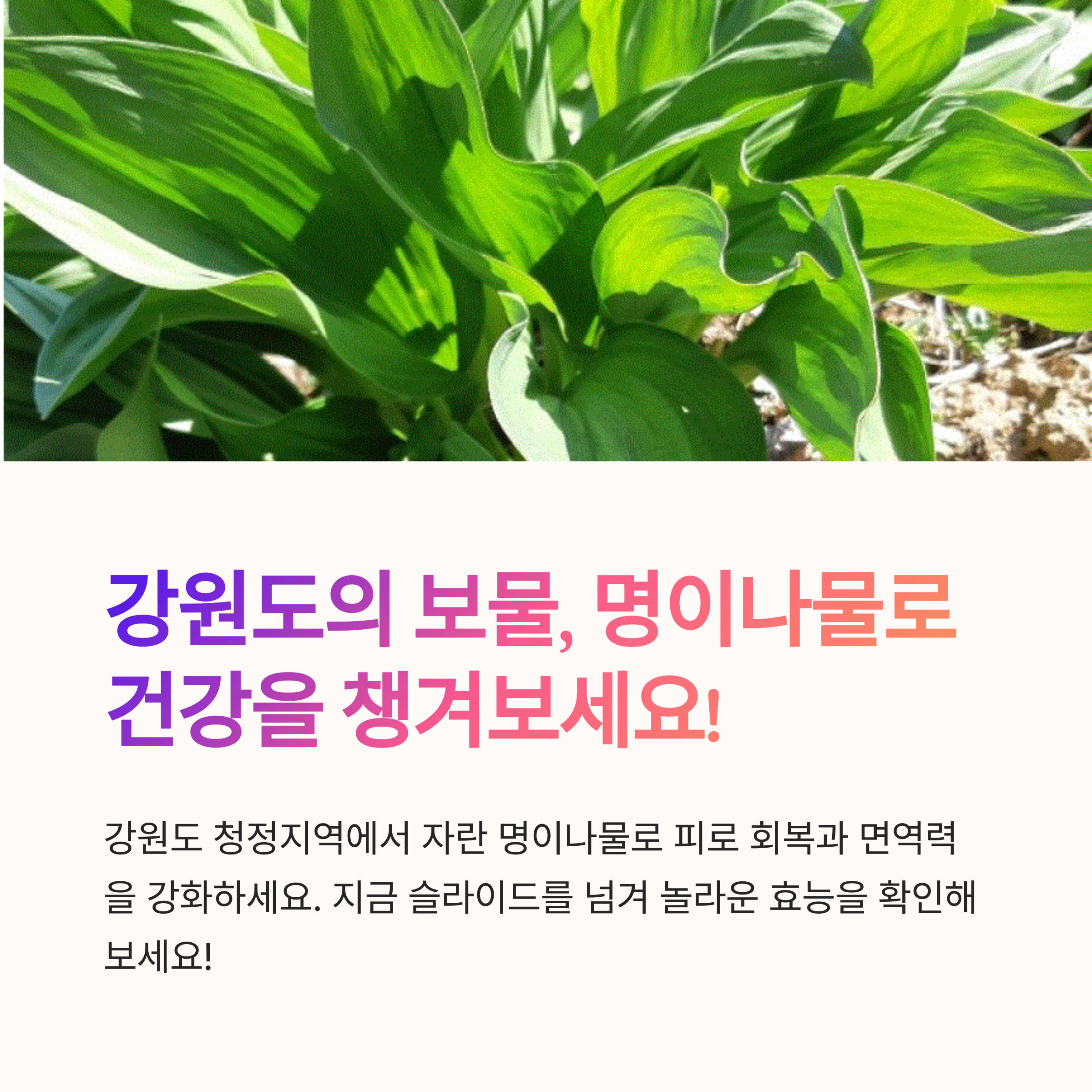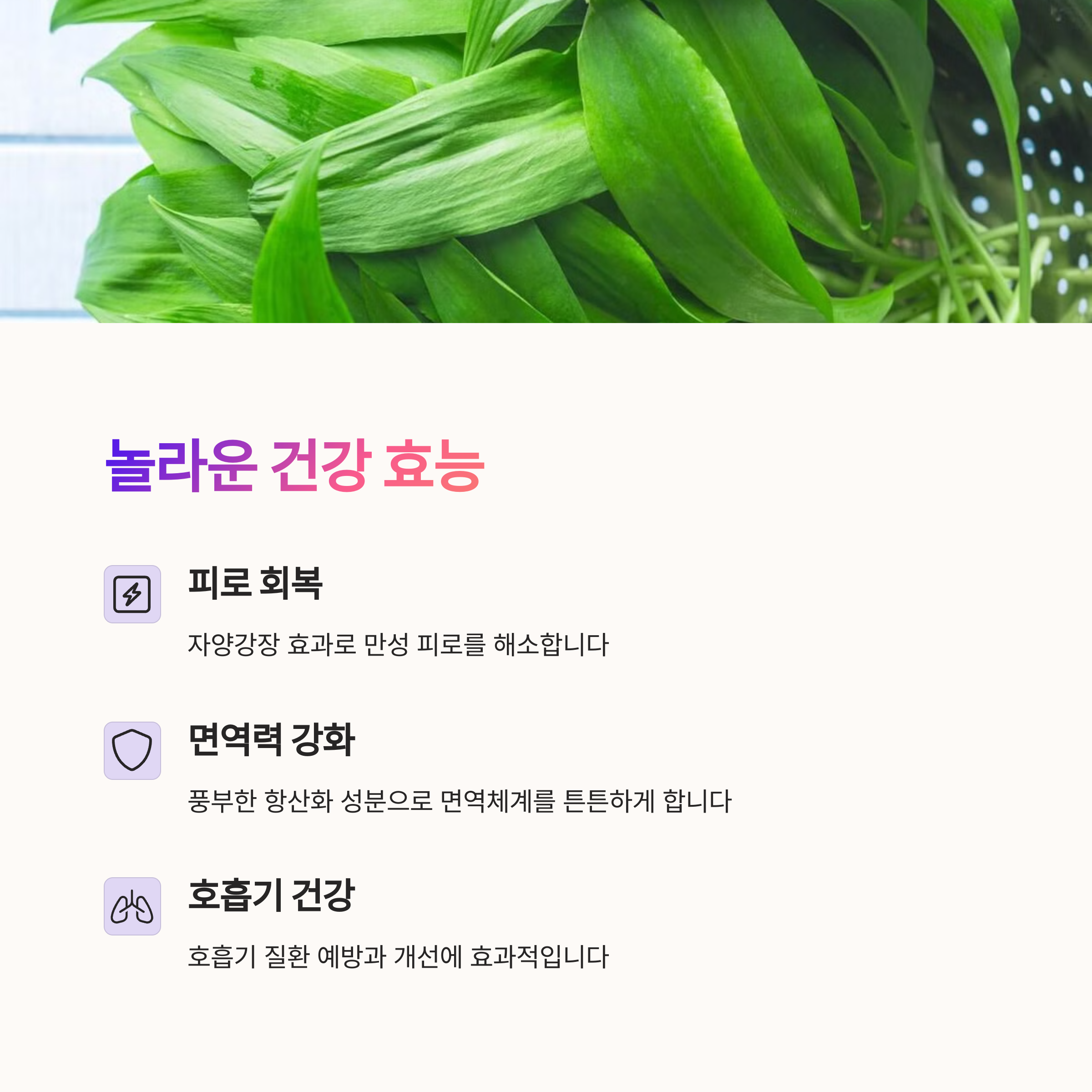 | 명이나물 | 자양강장 식물로, 피로회복에 도움을 줍니다 |