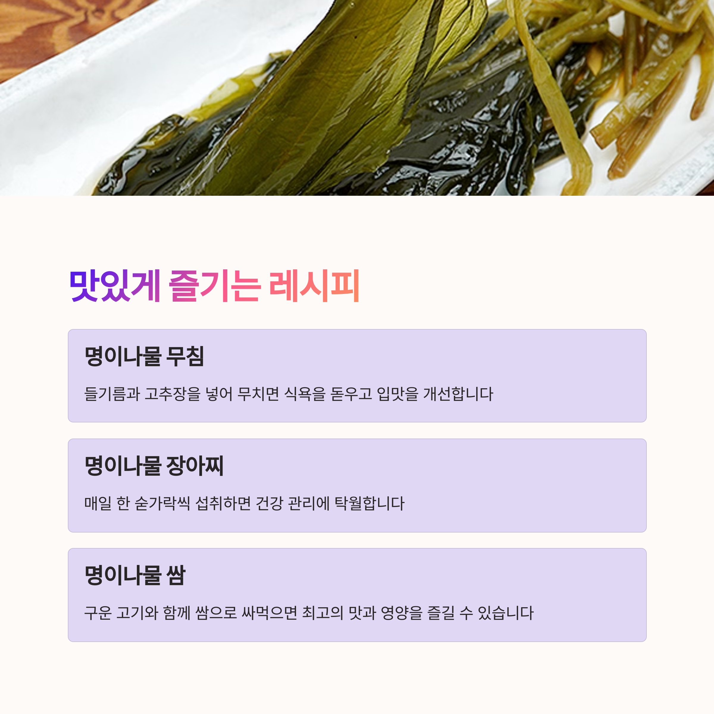 명이나물을 어떻게 활용하고 계신가요? 댓글로 여러분의 경험을 공유해주세요! 여러분의 소중한 의견을 기다리고 있습니다.