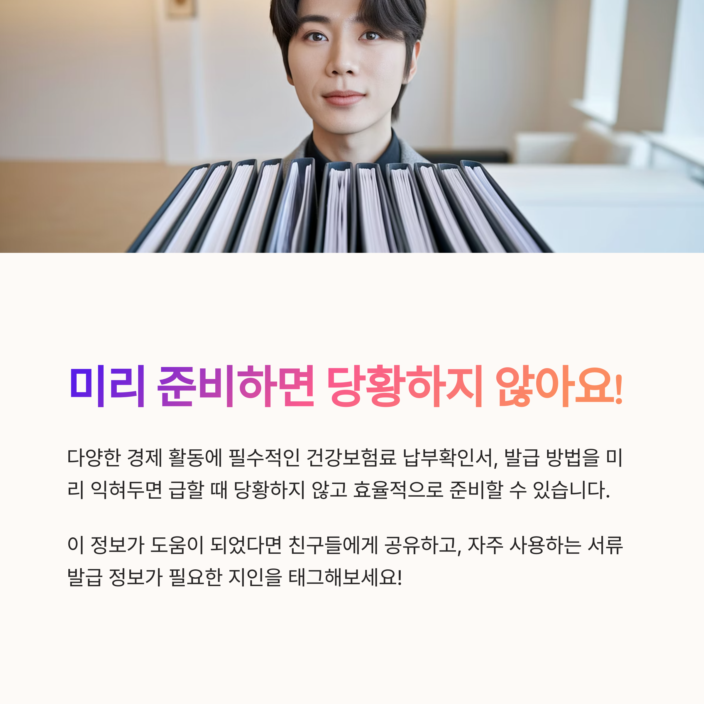 건강보험료 납부확인서는 행정 업무, 금융 거래, 그리고 소득 증빙 등 다양한 상황에서 꼭 필요한 문서입니다. 오늘 안내드린 정부24 및 건강보험공단 사이트 활용법을 잘 숙지하시면, 언제 어디서든 쉽고 빠르게 서류를 준비하실 수 있습니다. 실제로 많은 분들이 본 방법을 통해 빠르게 문제를 해결하고 있으며, 여러분도 더 이상 복잡한 절차 없이 서류를 출력할 수 있을 것입니다. 생활에 꼭 필요한 정보를 오늘 정확히 전달드렸기를 바라며, 도움이 되셨다면 주위 분들과 함께 공유해주세요.