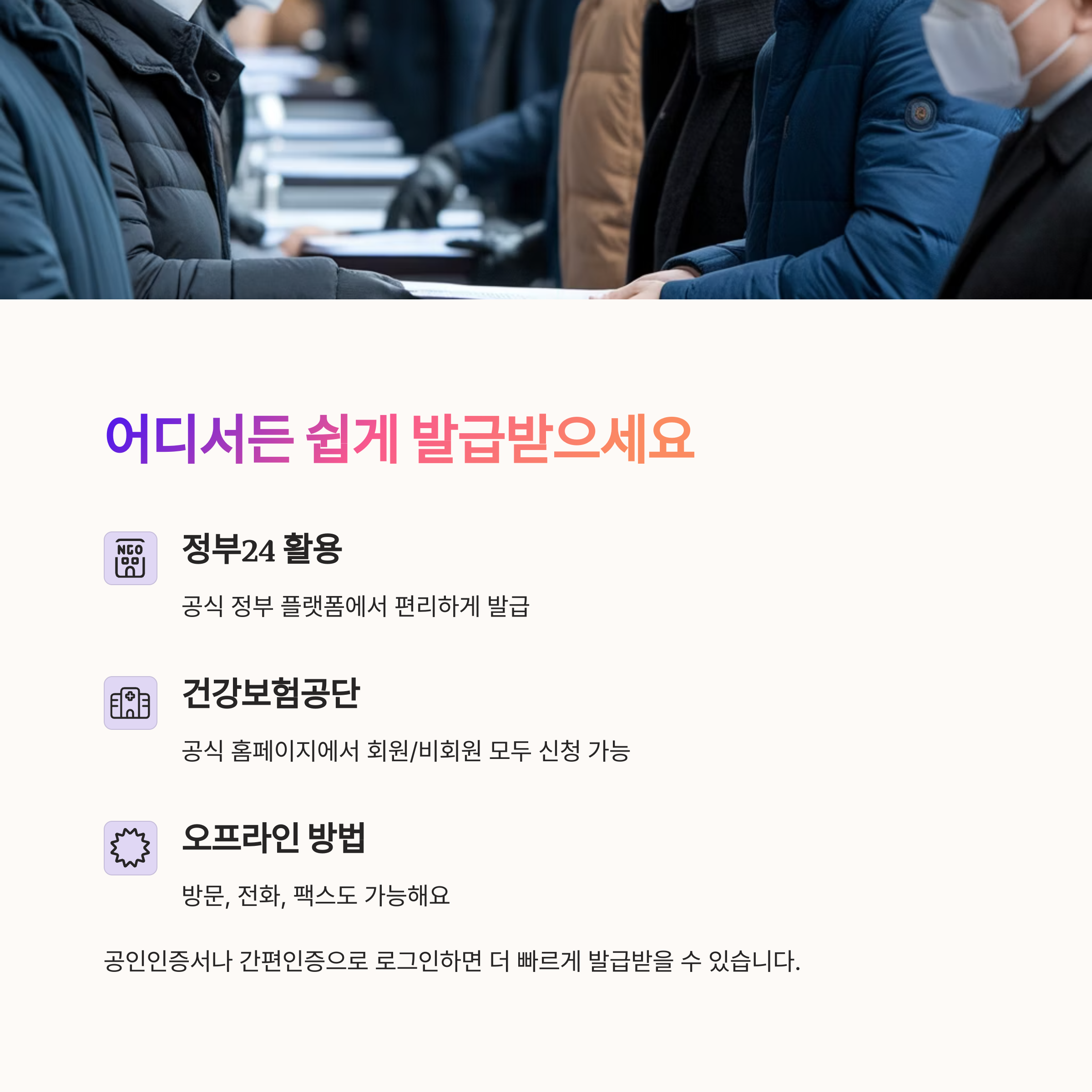 | 어디서 출력하나요? | 정부24 또는 국민건강보험공단 홈페이지에서 가능합니다. |