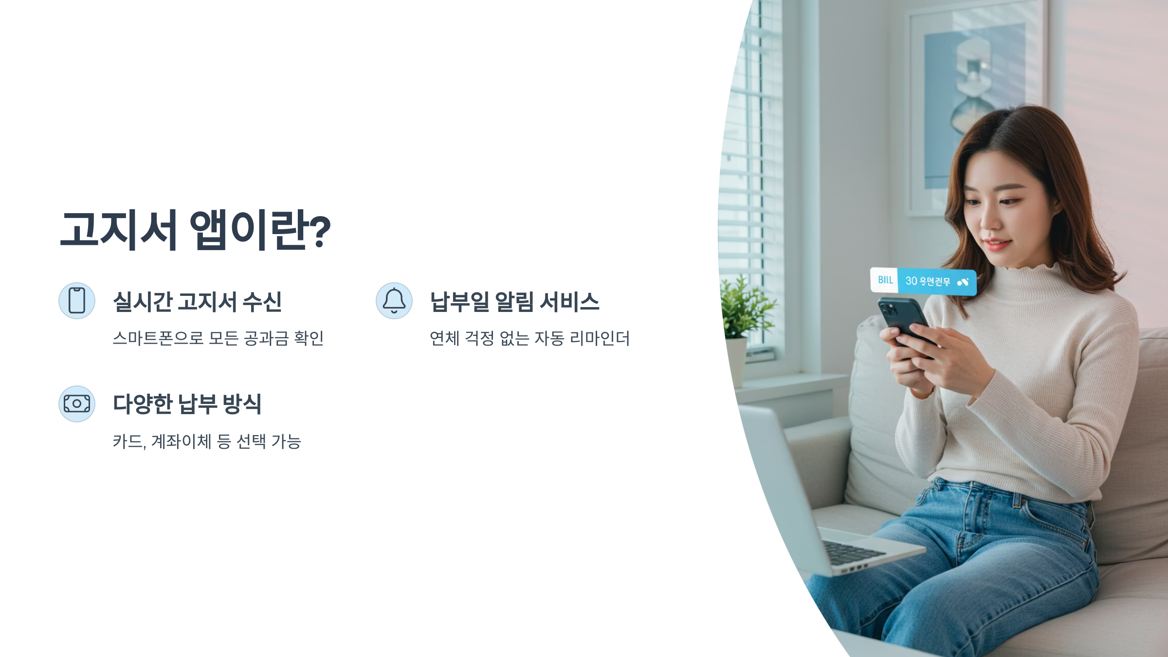 고지서 앱은 다양한 고지서를 스마트폰으로 실시간 수신하고, 납부까지 연결해주는 통합 청구 플랫폼입니다.