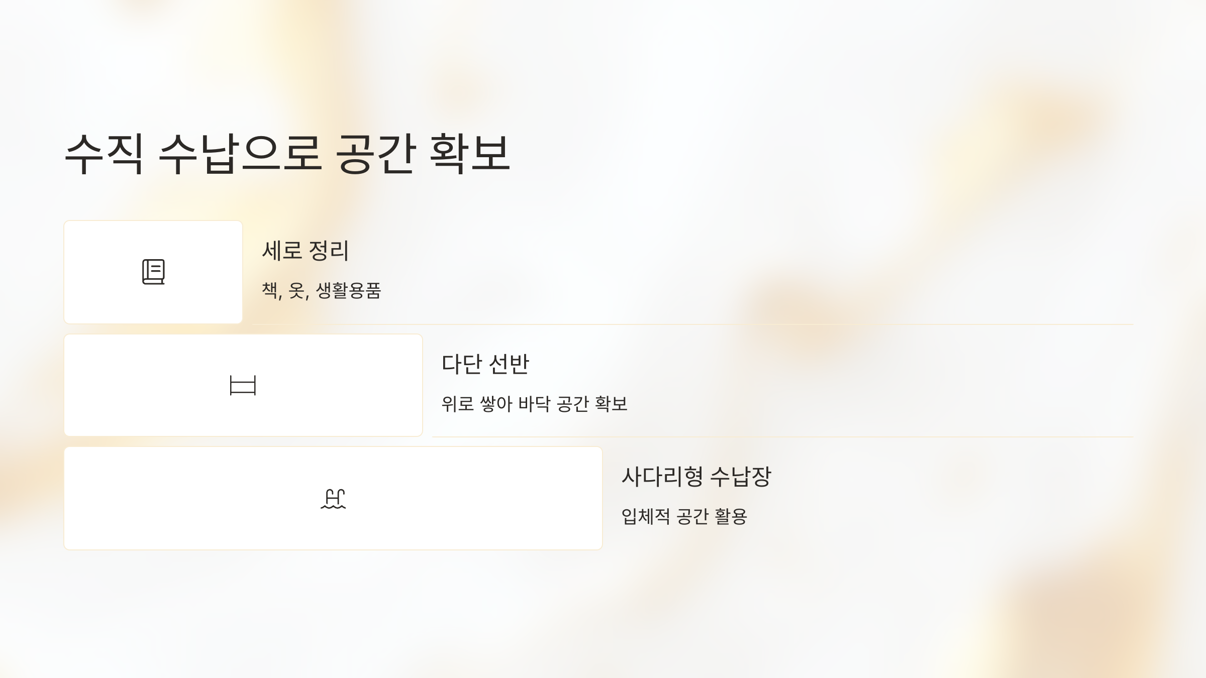 다단 선반, 사다리형 수납장 등을 적극 활용하세요.