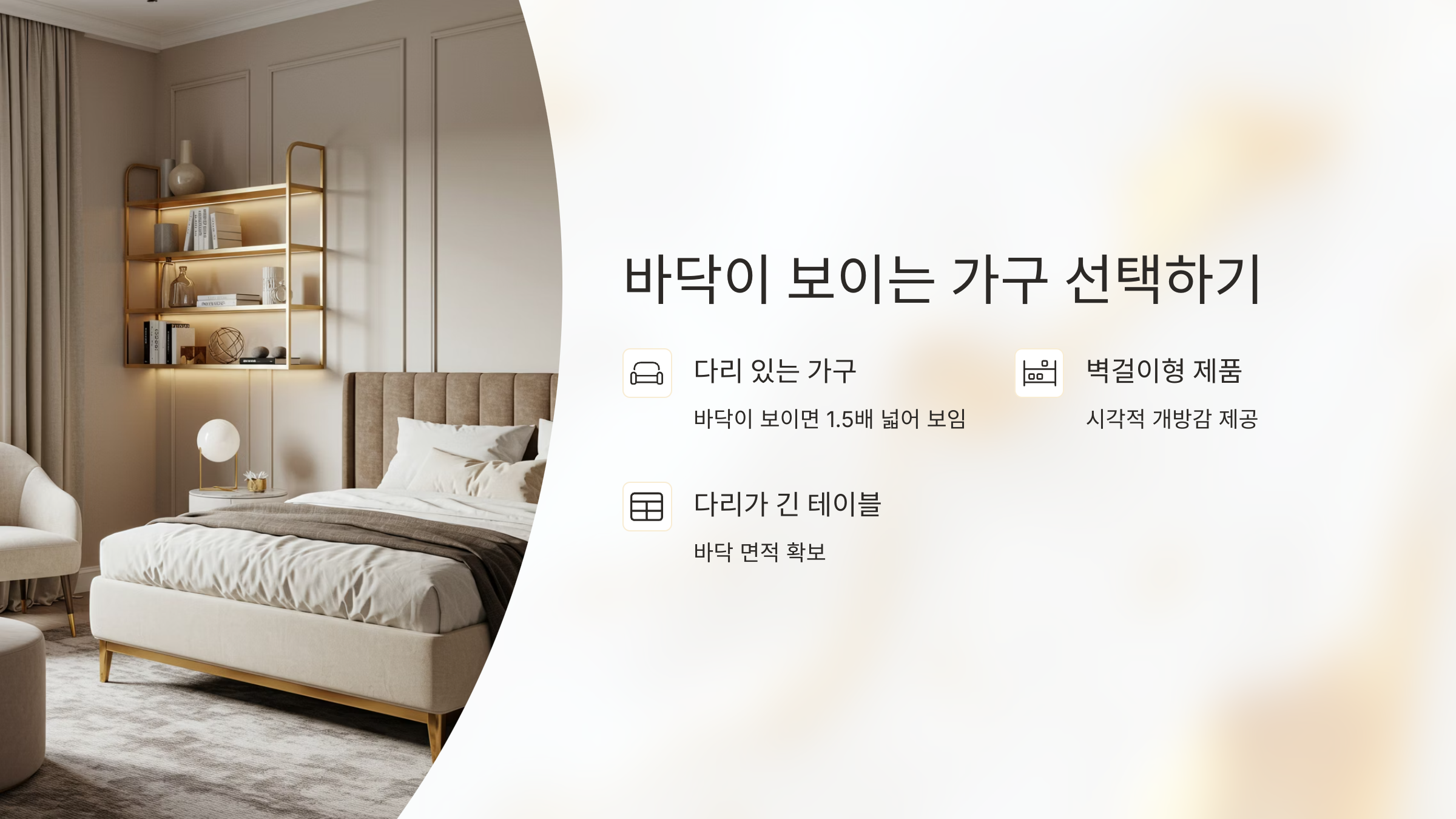 "바닥 면적이 보이면 실제보다 1.5배 넓어 보입니다."