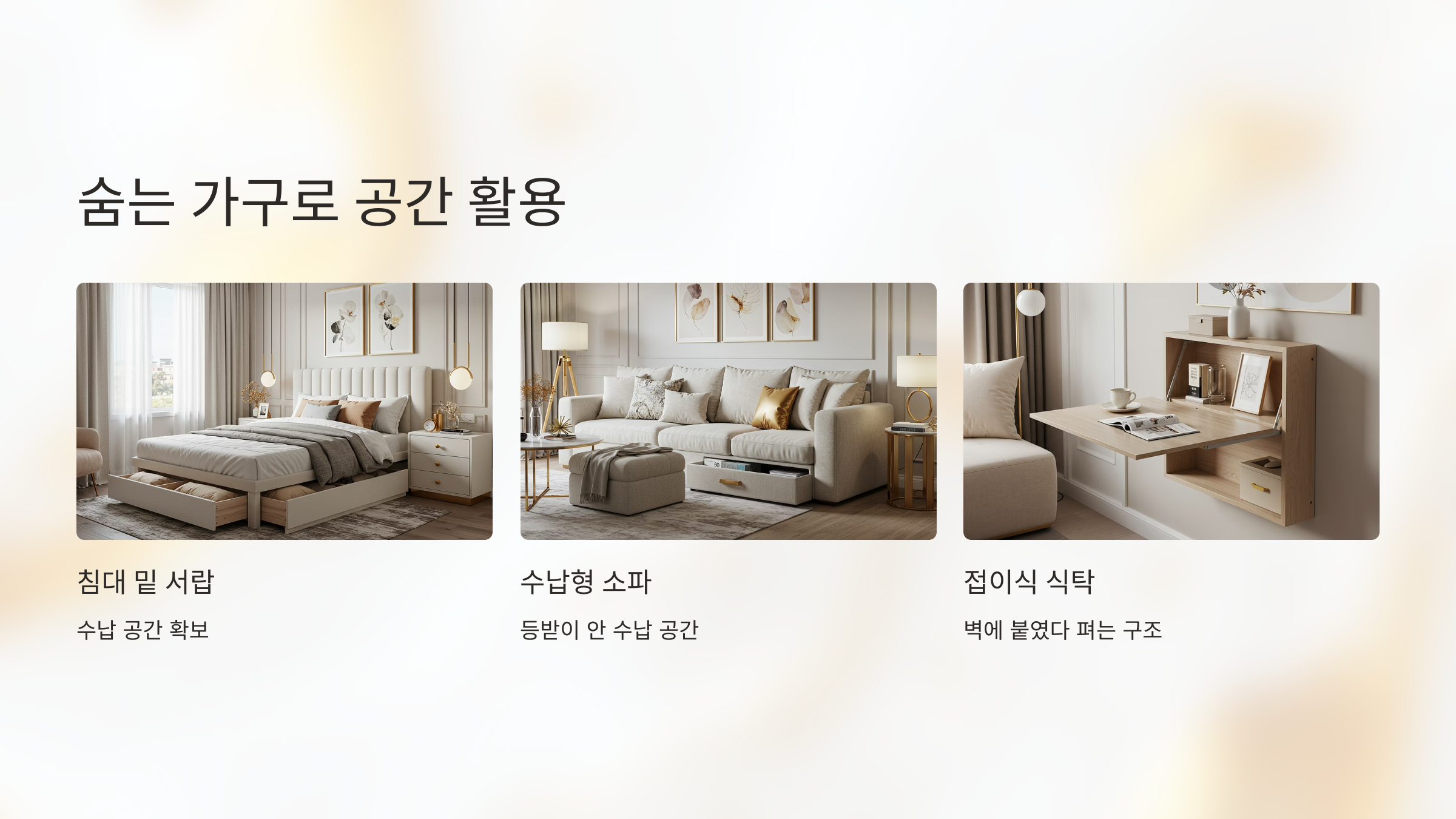 최근 인기인 수납형 소파, 침대 프레임, 접이식 테이블 등을 활용하면