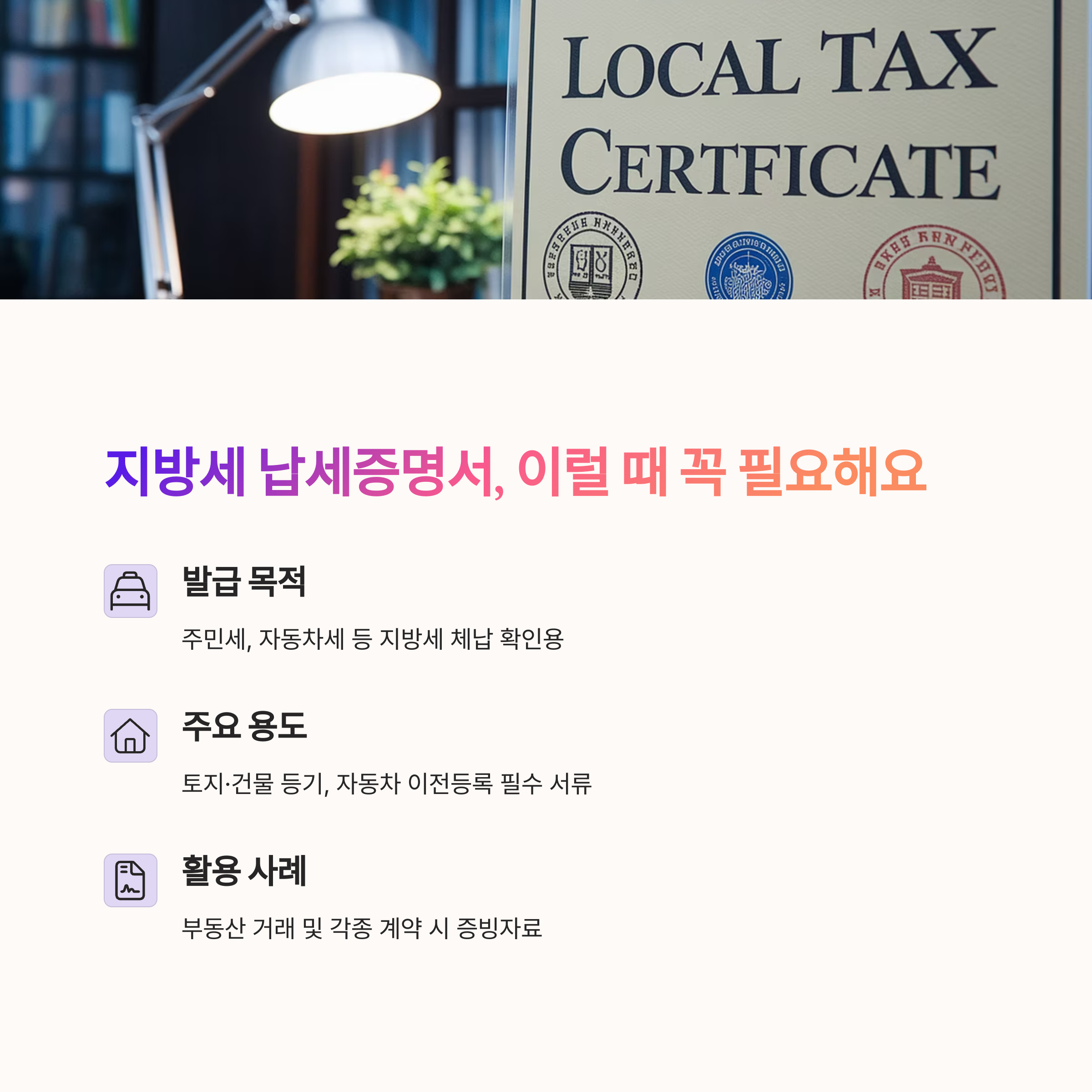 "지방세 납세증명서는 시청이나 구청에서 부과하는 지방세에 대한 납부 여부를 증명합니다"
