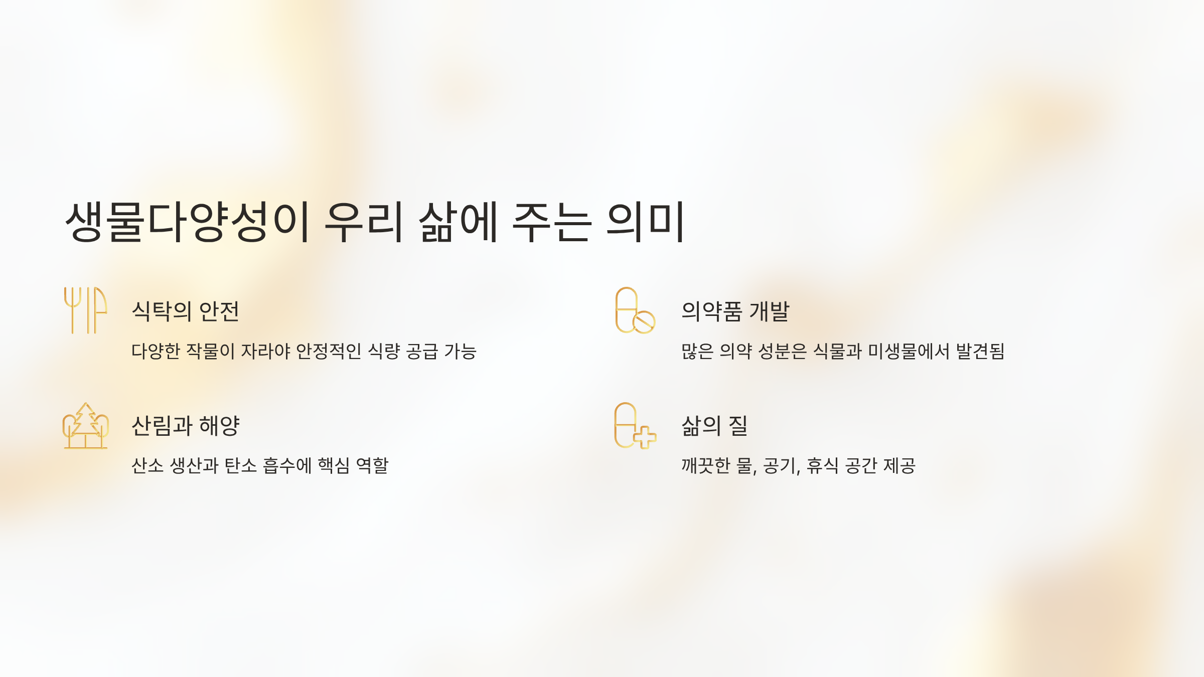 - 💊 의약품 개발 : 많은 의약 성분은 식물과 미생물에서 발견됨