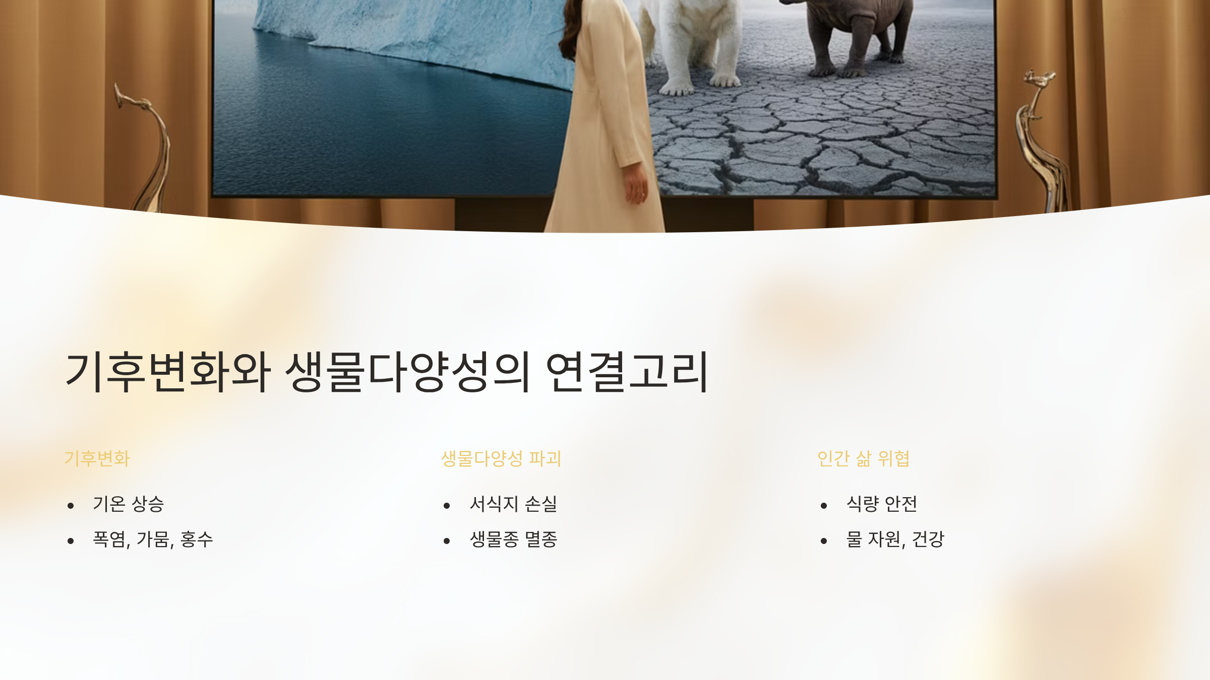 - 폭염, 가뭄, 홍수, 산불 같은 극한 기후 현상이 점점 더 잦아지고 있는데, 이는 곧 생태계 파괴와 생물종 멸종으로 이어집니다.