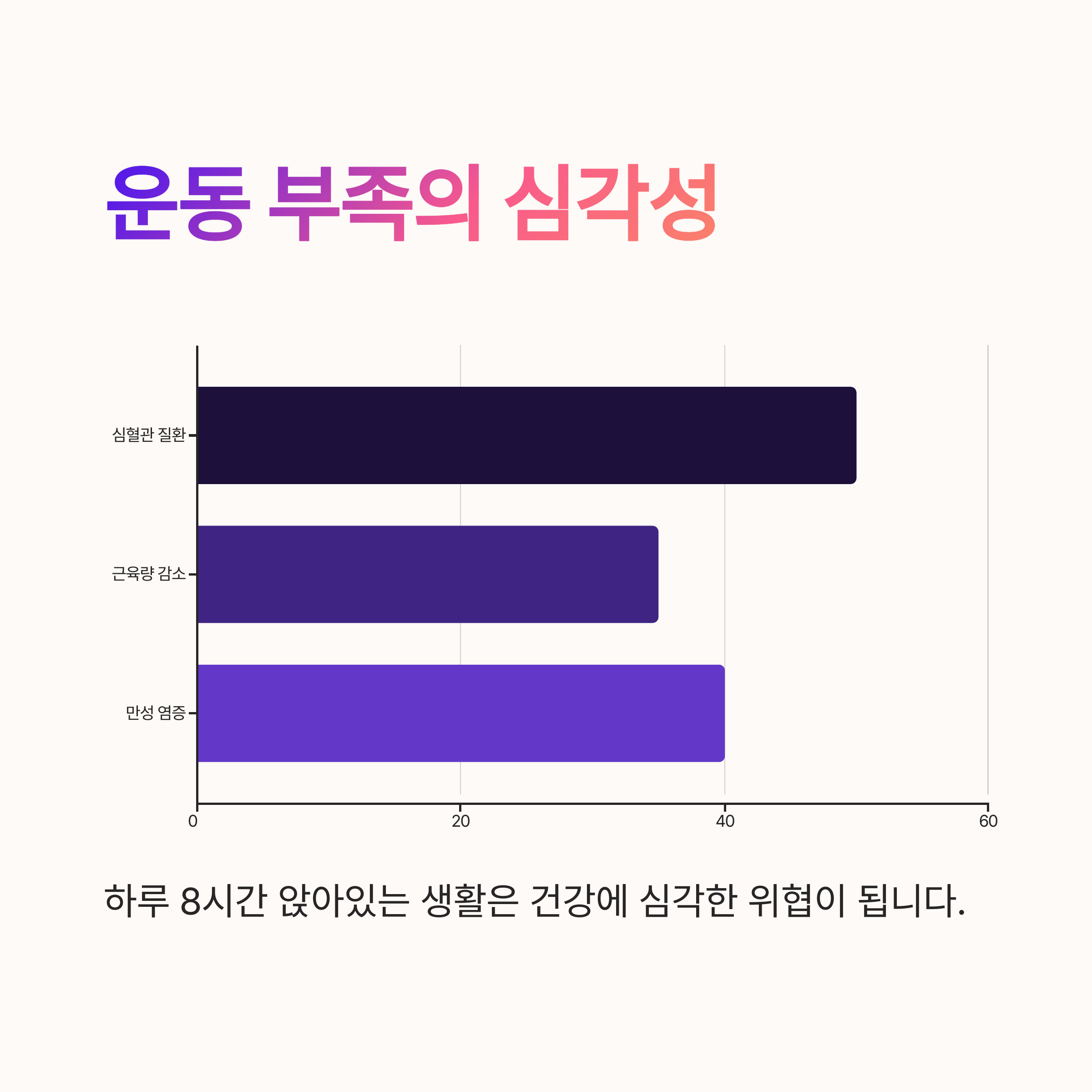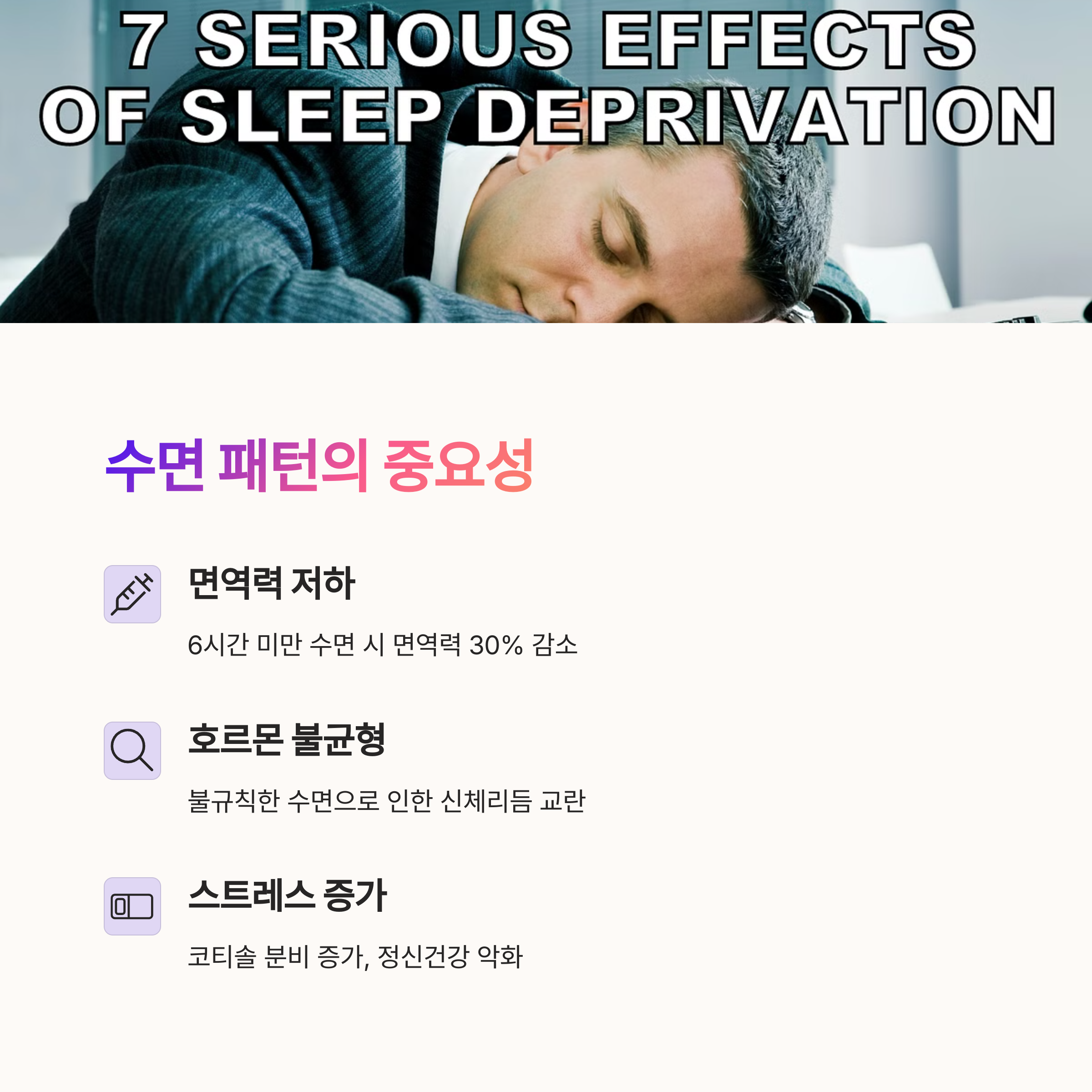 | 장기적으로 체중 증가, 위장 질환 유발 가능 | 근육 감소 및 혈액순환 저하 | 수면장애 및 면역력 저하 |