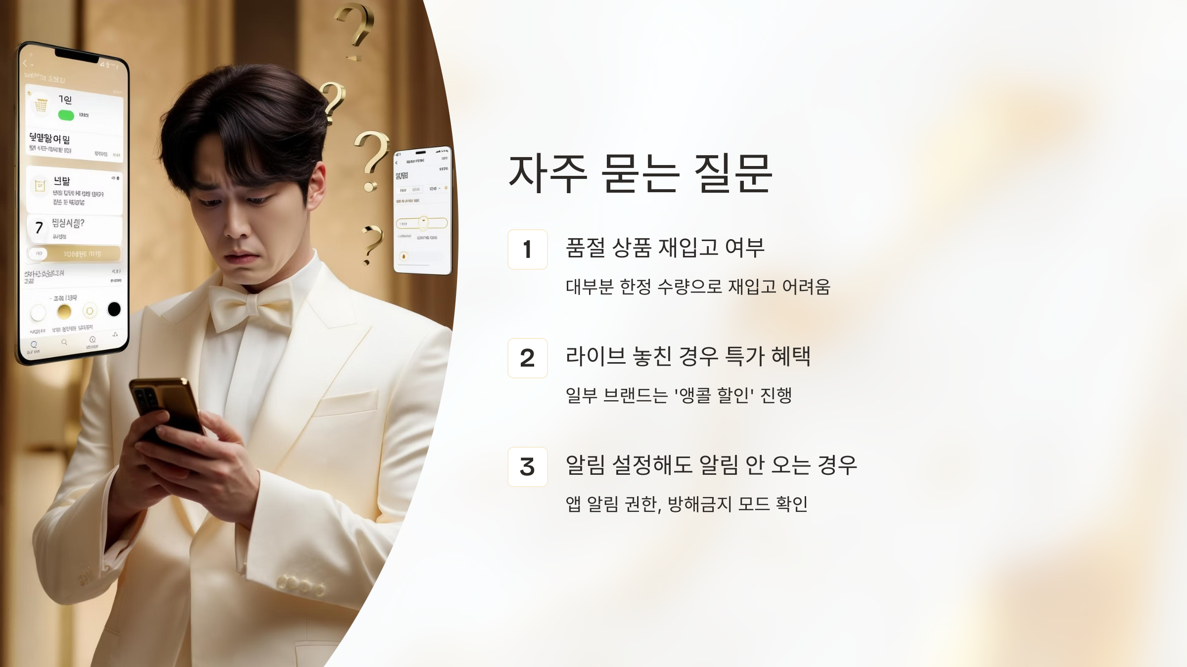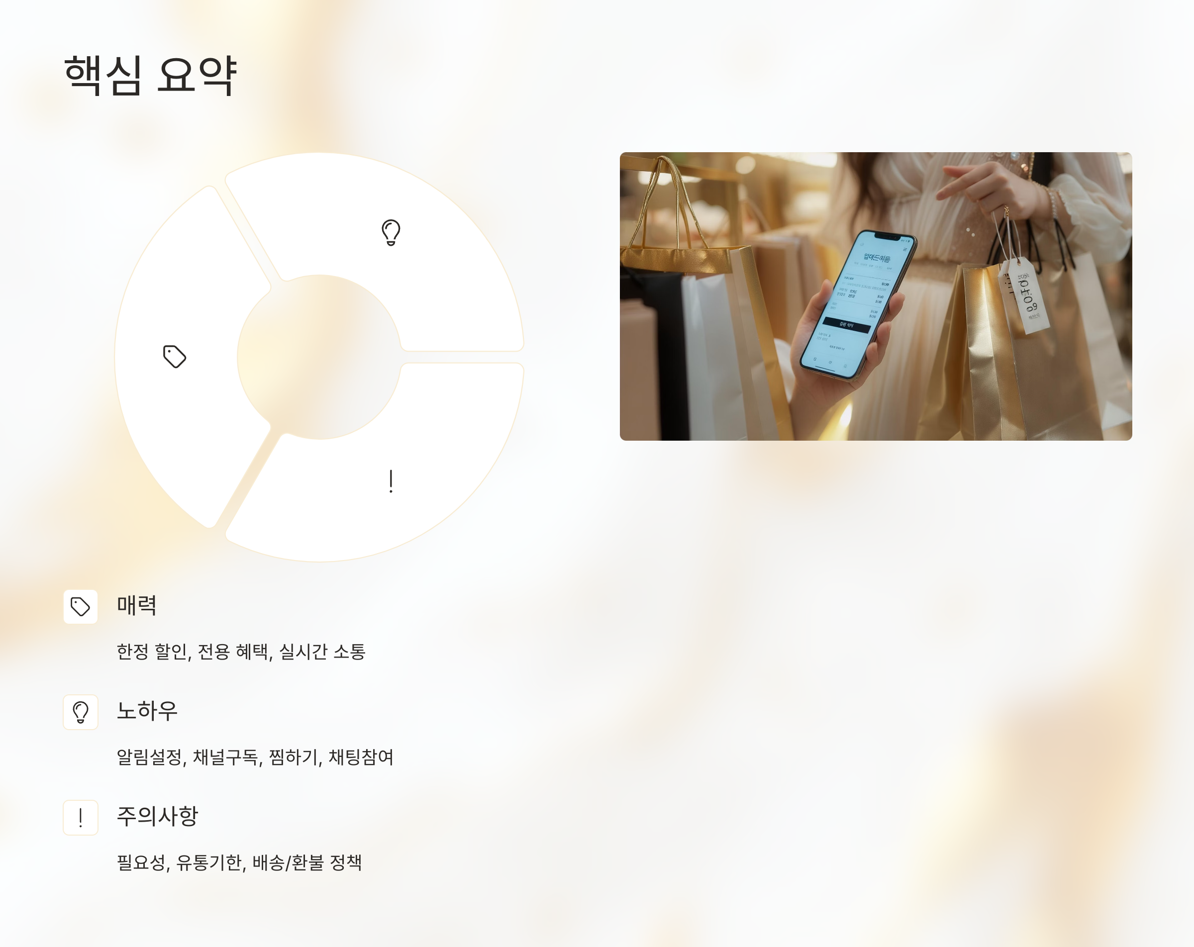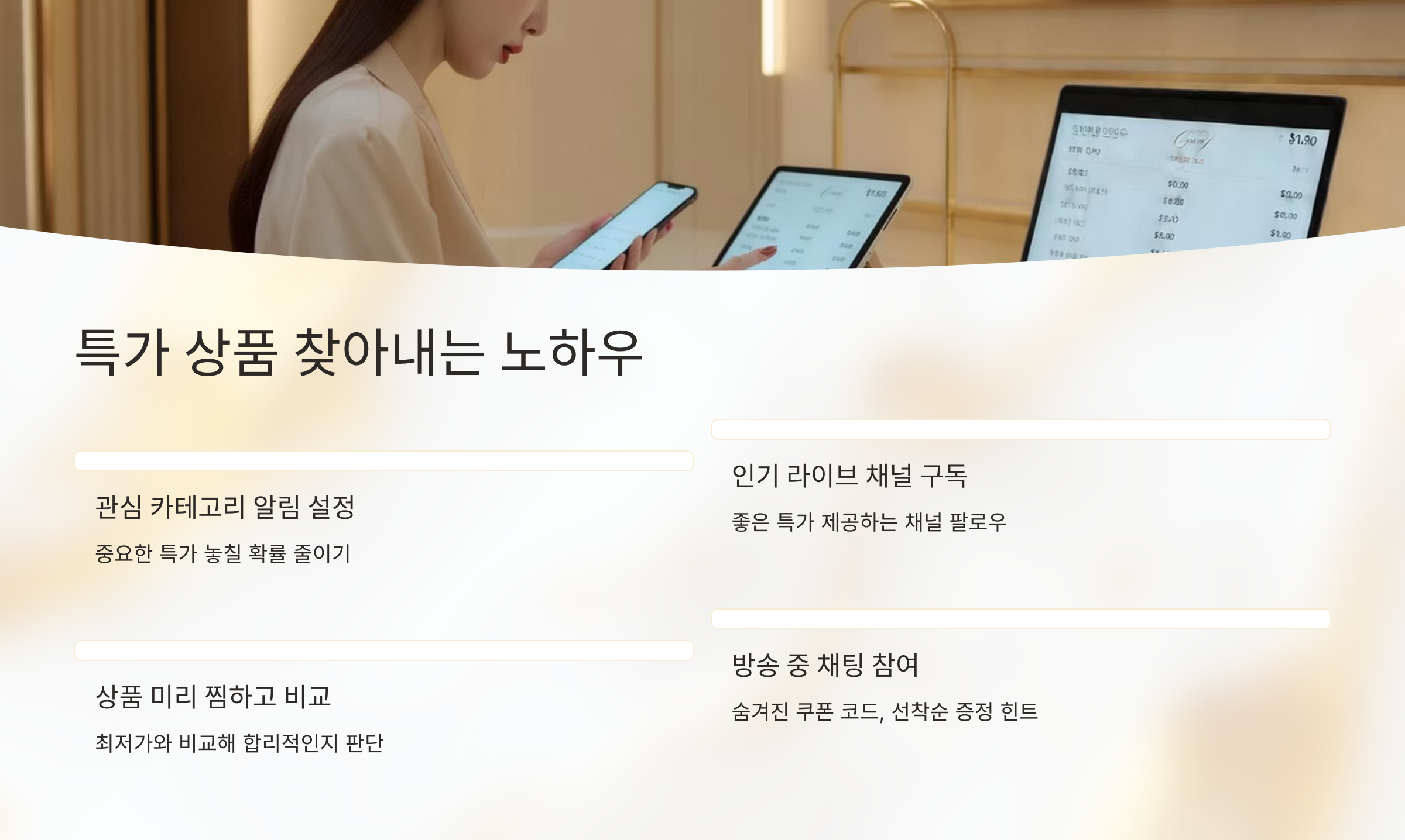 - 득템 노하우: 관심 카테고리 알림, 인기 채널 구독, 상품 미리 찜 비교, 방송 중 채팅 참여가 핵심이에요.