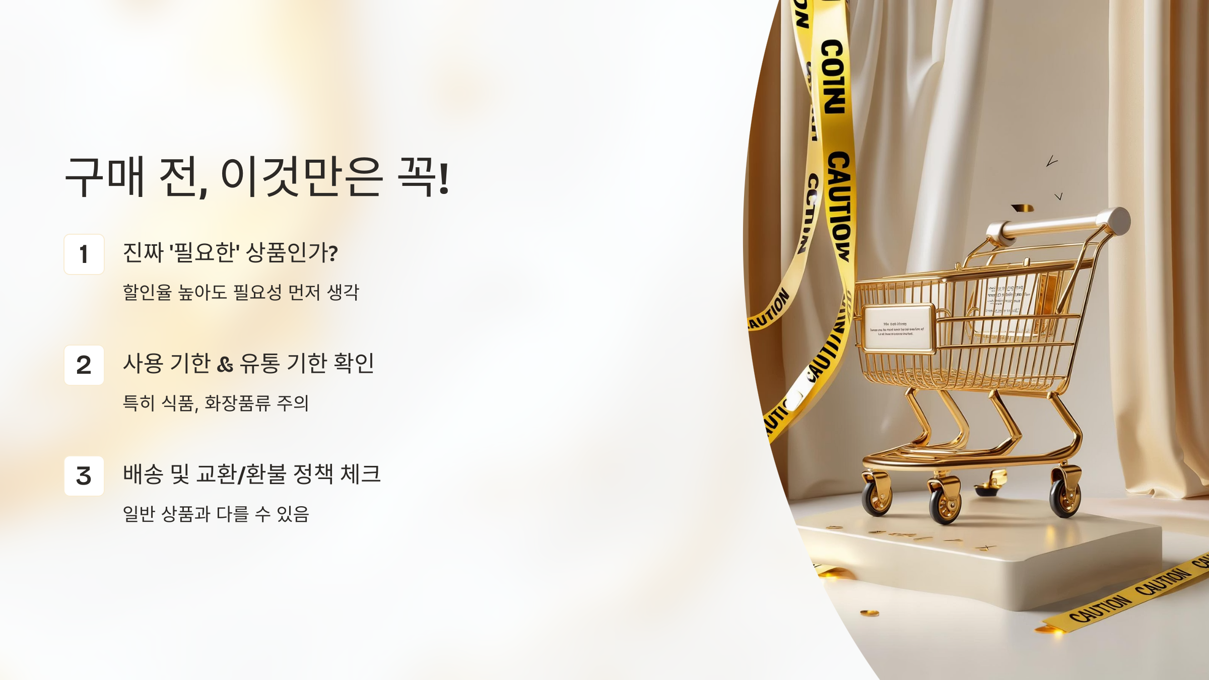 - 구매 전 주의사항: 진짜 필요한 물건인지, 유통기한은 충분한지, 배송/환불 정책은 어떤지 꼭 확인하세요!