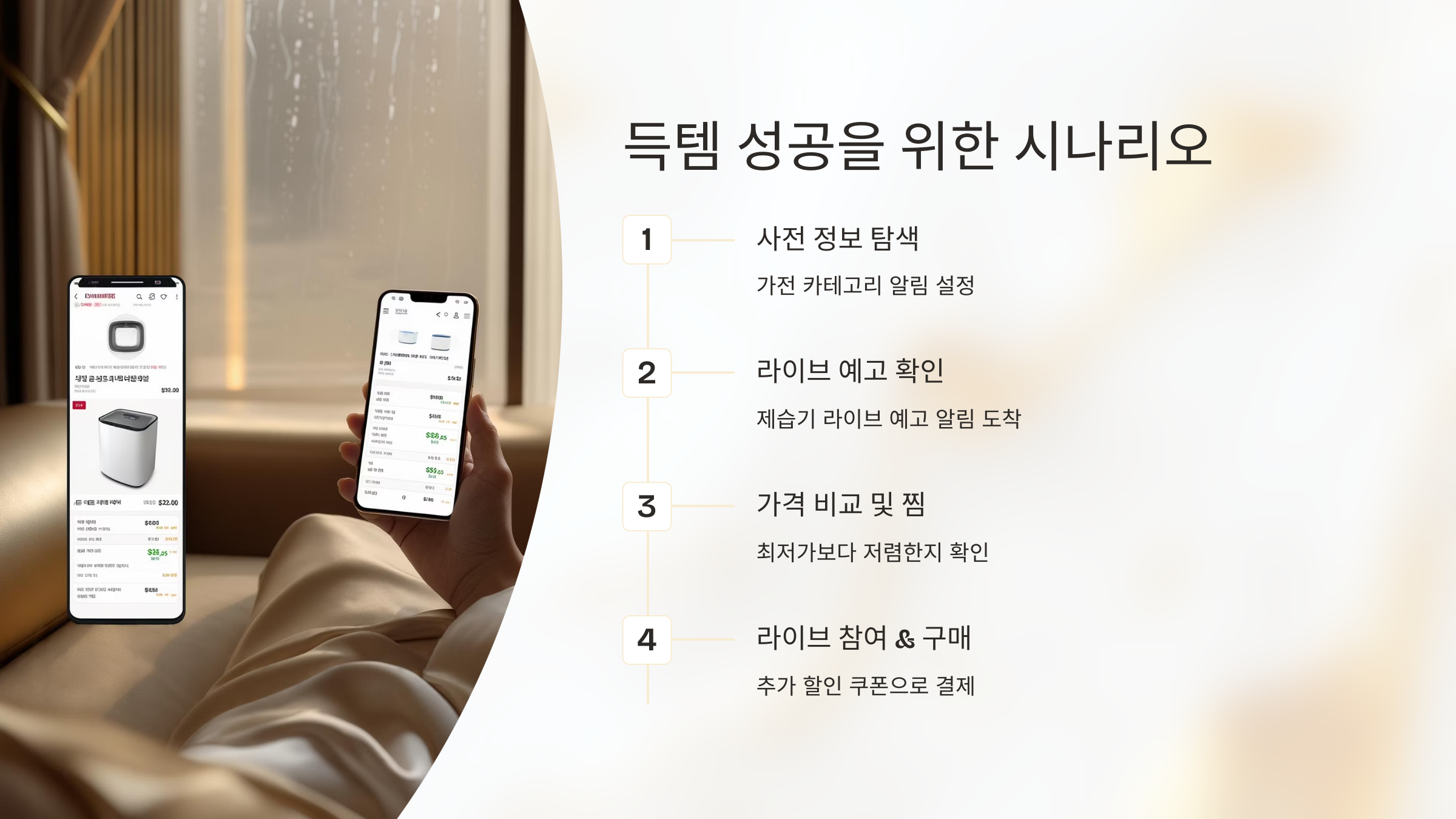 - 방송 시작 알림과 동시에 입장! 진행자의 설명 경청하며 채팅창으로 '습기 제거 능력'에 대해 질문. - 진행자가 깜짝 '5% 추가 할인 쿠폰'을 방송 중에만 공개! 빠르게 쿠폰 다운로드 후 결제! - 결과: 최저가보다 더 저렴한 가격에 추가 할인까지 받아 대만족!