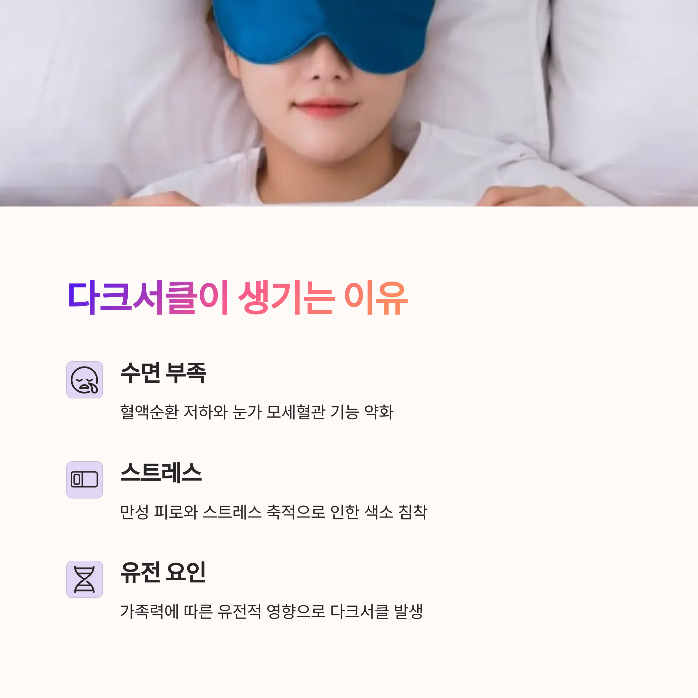 | 다크서클 원인 | 수면 부족과 눈가 혈액순환 저하가 큰 원인입니다. |