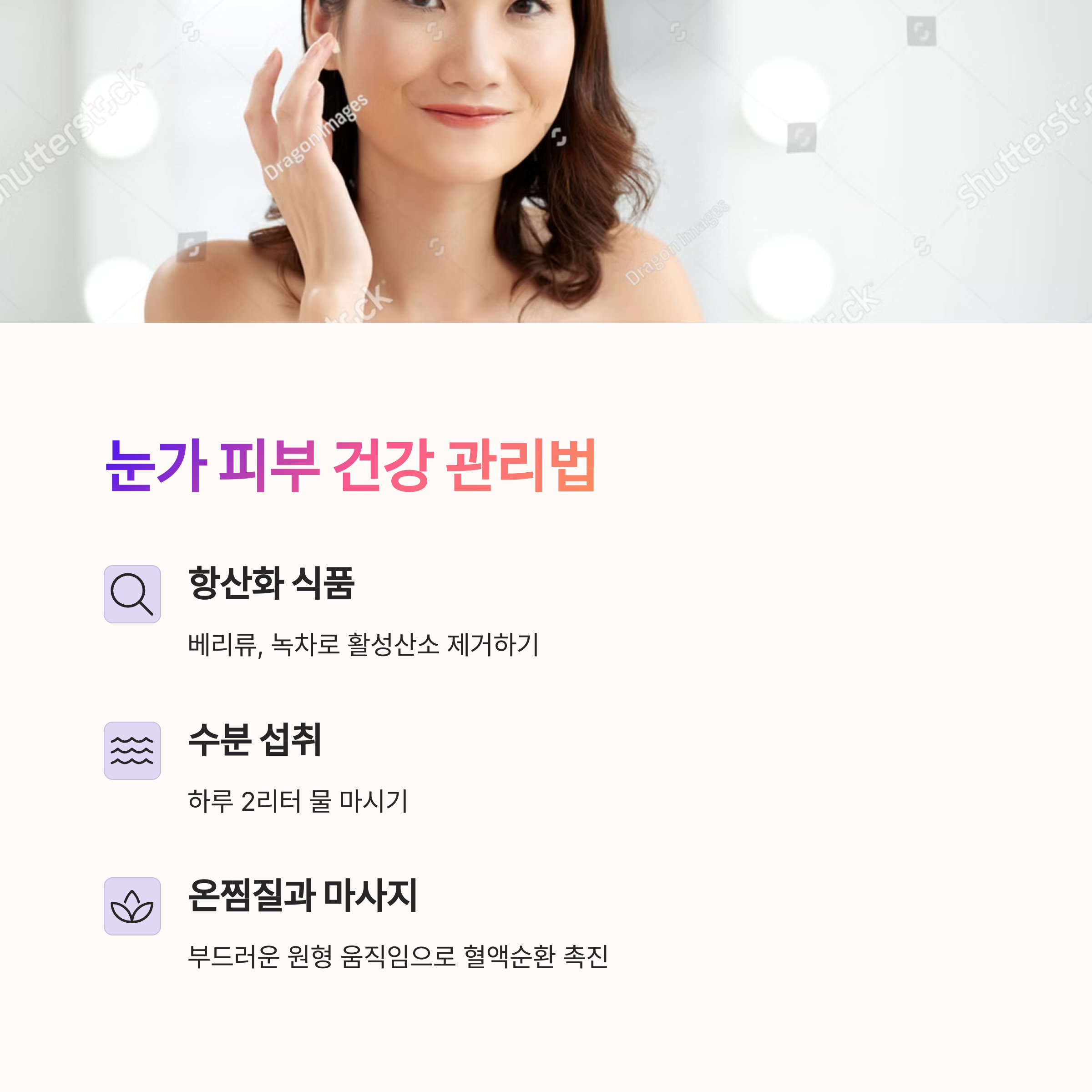 | 피부에 좋은 음식 | 항산화 성분 풍부한 채소와 수분 많은 과일이 도움돼요. |