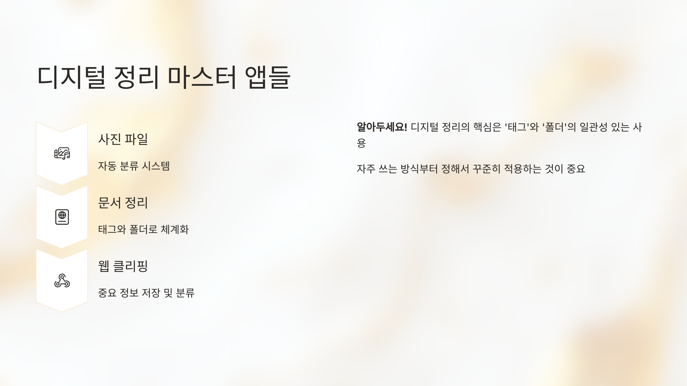 사진 파일, 문서, 웹 클리핑... 디지털 세상도 아날로그 못지않게 복잡하죠? 이 앱들이면 디지털 공간도 완벽하게 정리할 수 있어요!