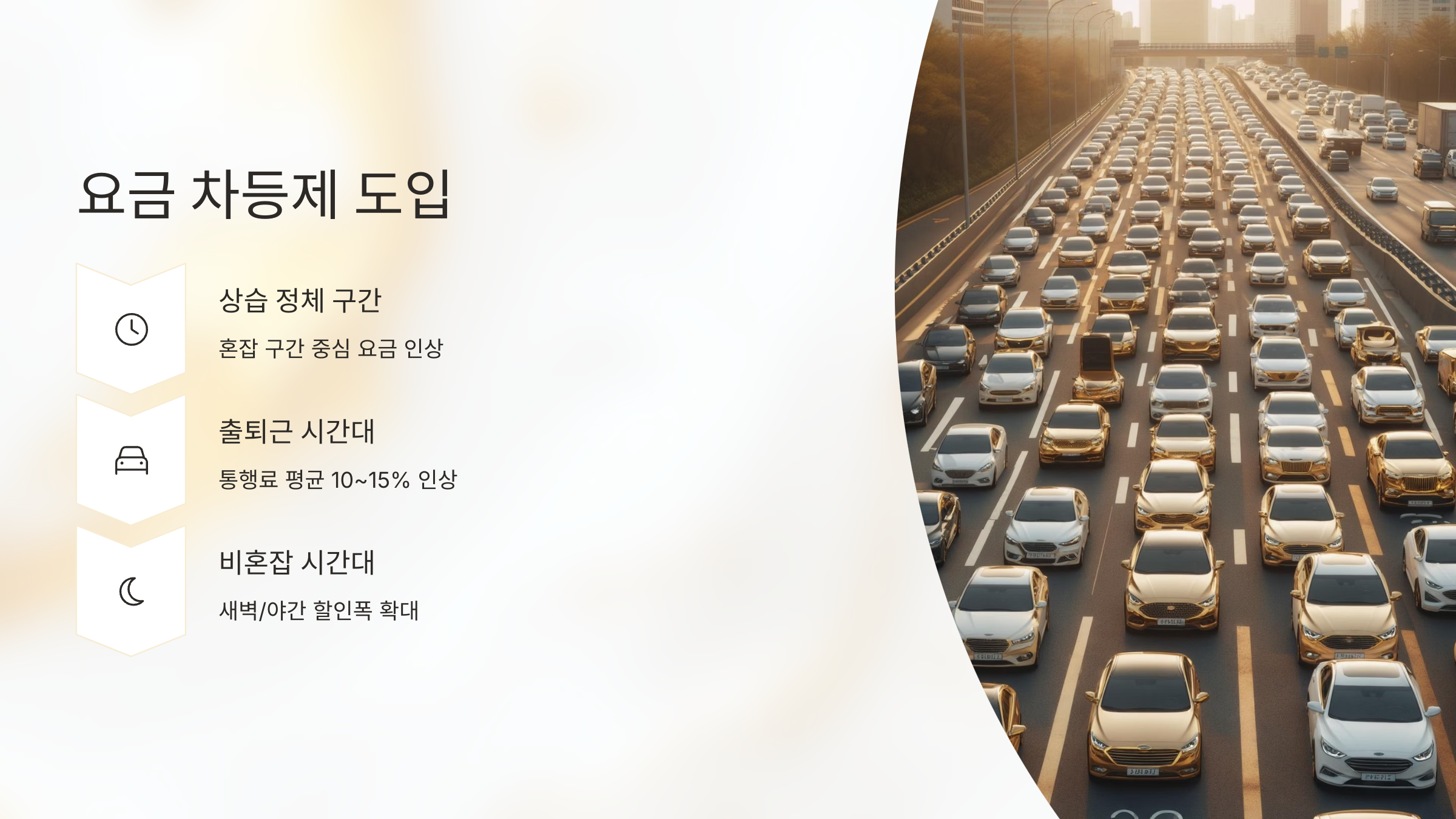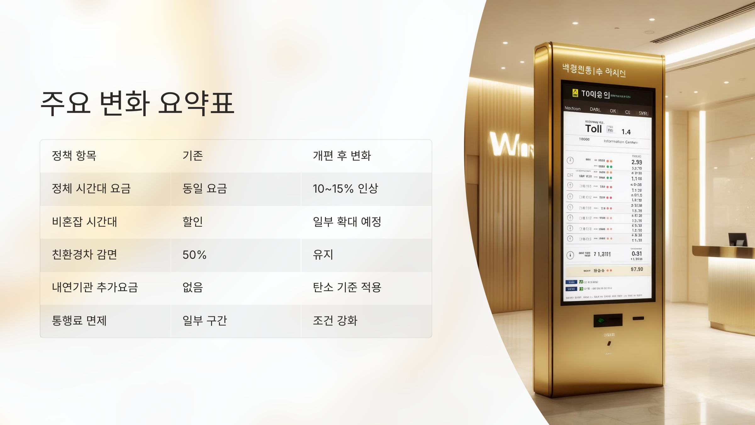 이번 개편은 정체 유발 구간의 요금 차등 적용, 할인 정책 조정, 무인차량 통행료 제도 강화 등이 핵심입니다.