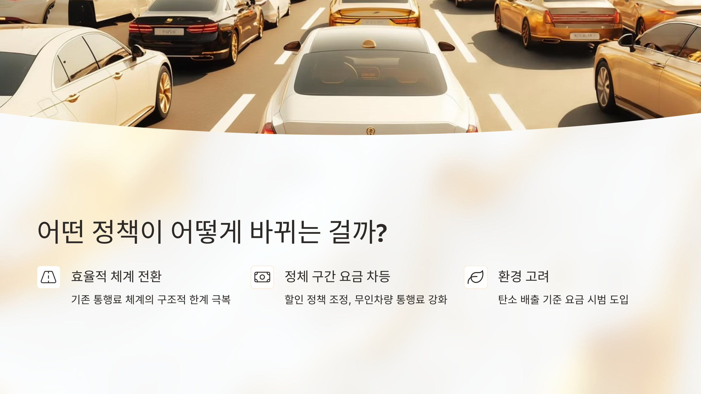 그동안 통행료 수입 감소와 유지관리 비용 상승 등의 문제가 반복되며 기존 통행료 체계의 구조적 한계가 드러났기 때문입니다.