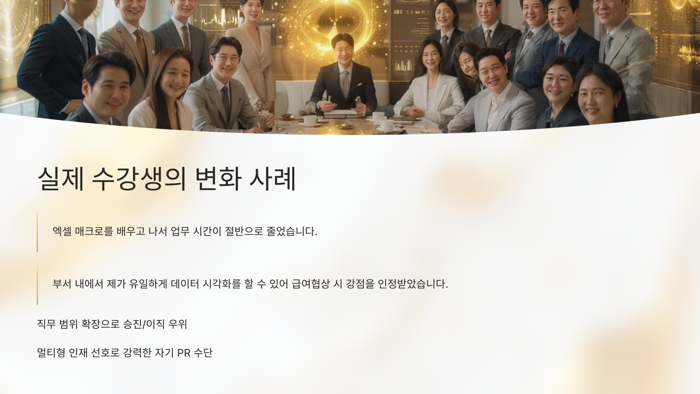 "엑셀 매크로를 배우고 나서 업무 시간이 절반으로 줄었습니다."