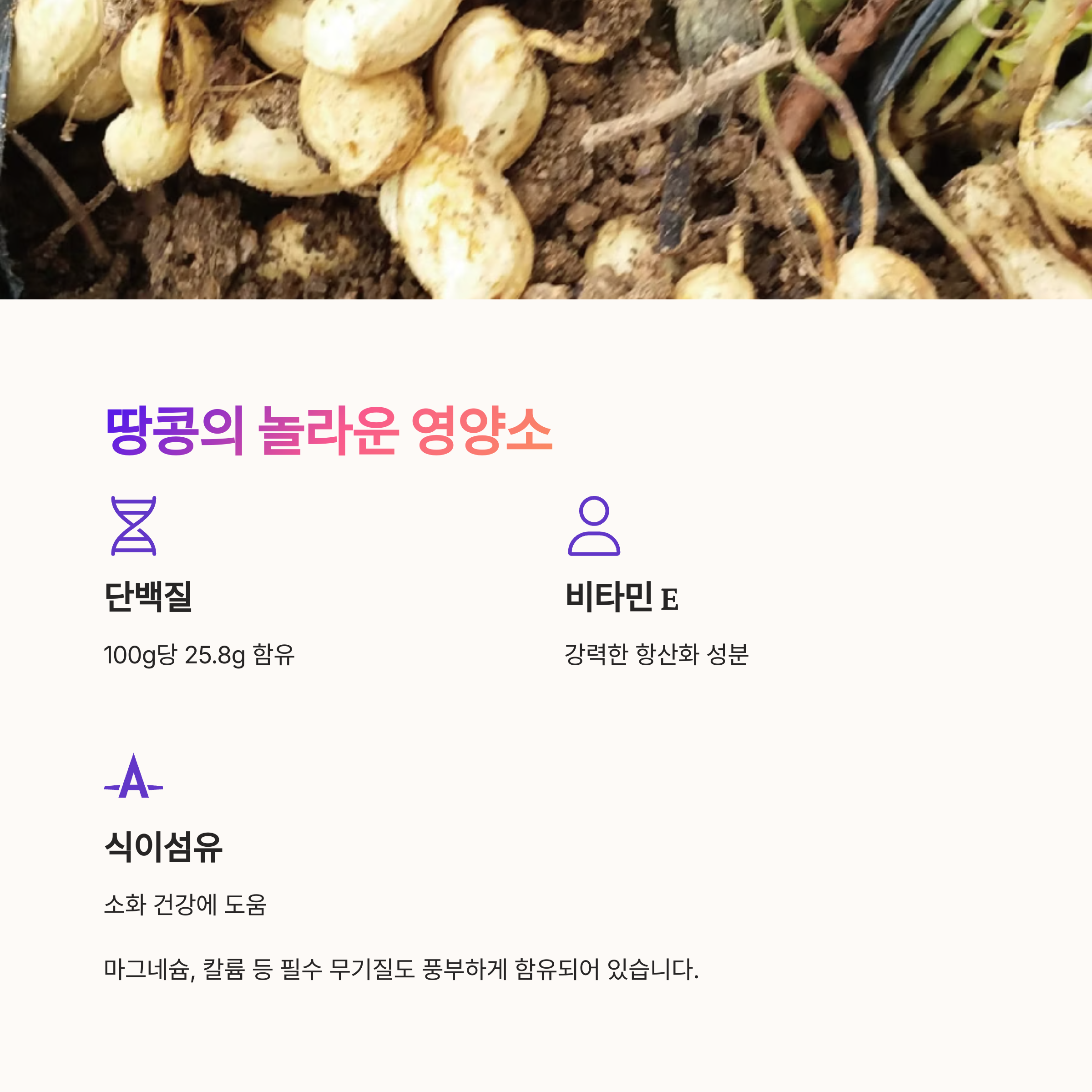 | 땅콩 효능 | 심장 건강, 노화 방지, 피부 개선에 효과적입니다. |