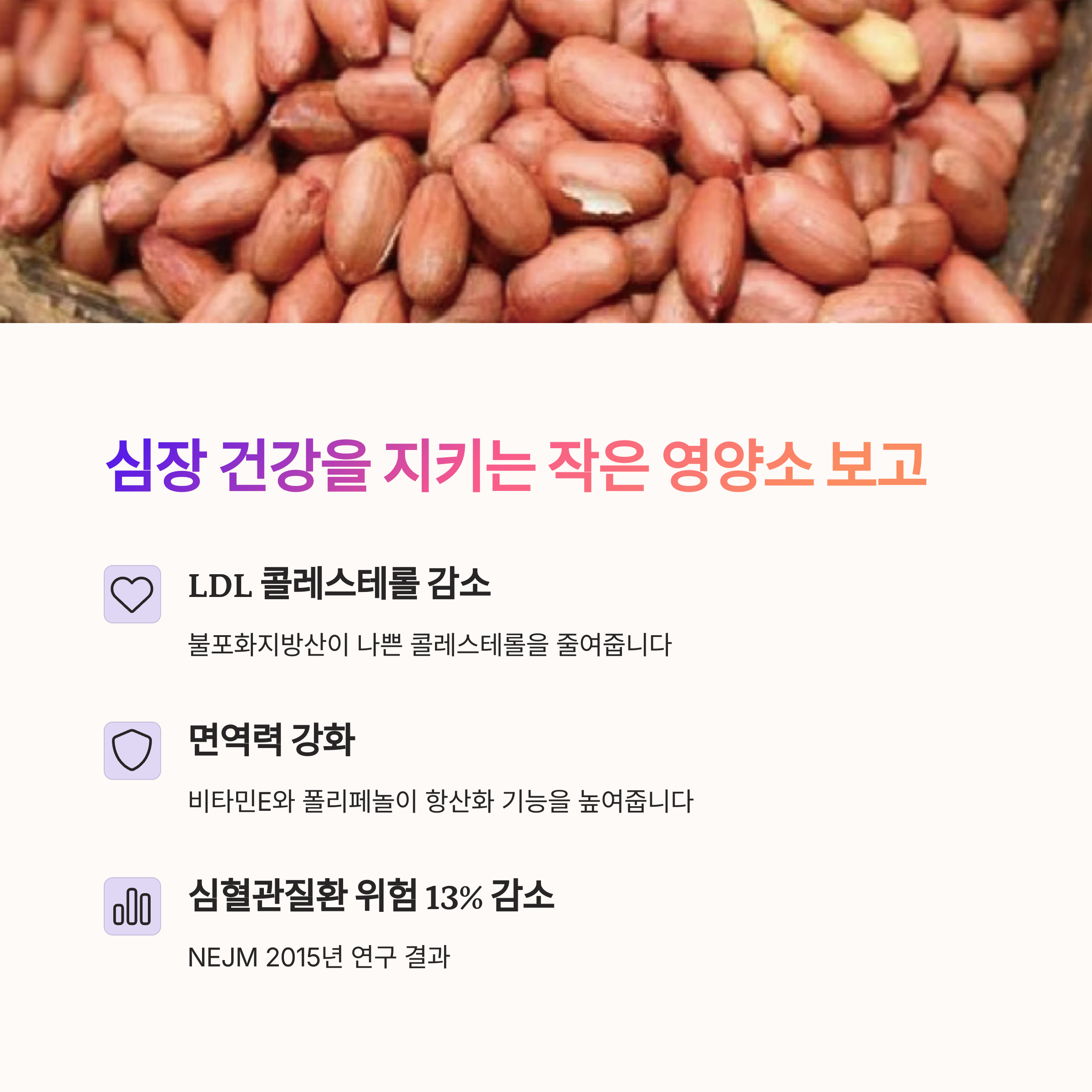 땅콩은 오래전부터 우리의 식탁에서 익숙한 식품이었지만, 최근에는 그 효능이 과학적으로 밝혀지며 슈퍼푸드로서의 가치를 인정받고 있습니다. 특히 땅콩 속에 풍부한 불포화지방산은 혈중 콜레스테롤 수치를 낮추고 심장병 예방에 탁월한 효과를 보여줍니다. 꾸준한 섭취는 혈관 건강은 물론 전반적인 면역력 증진에도 도움이 되며, 간식으로 땅콩을 선택하는 것만으로도 건강한 라이프스타일을 유지할 수 있습니다.