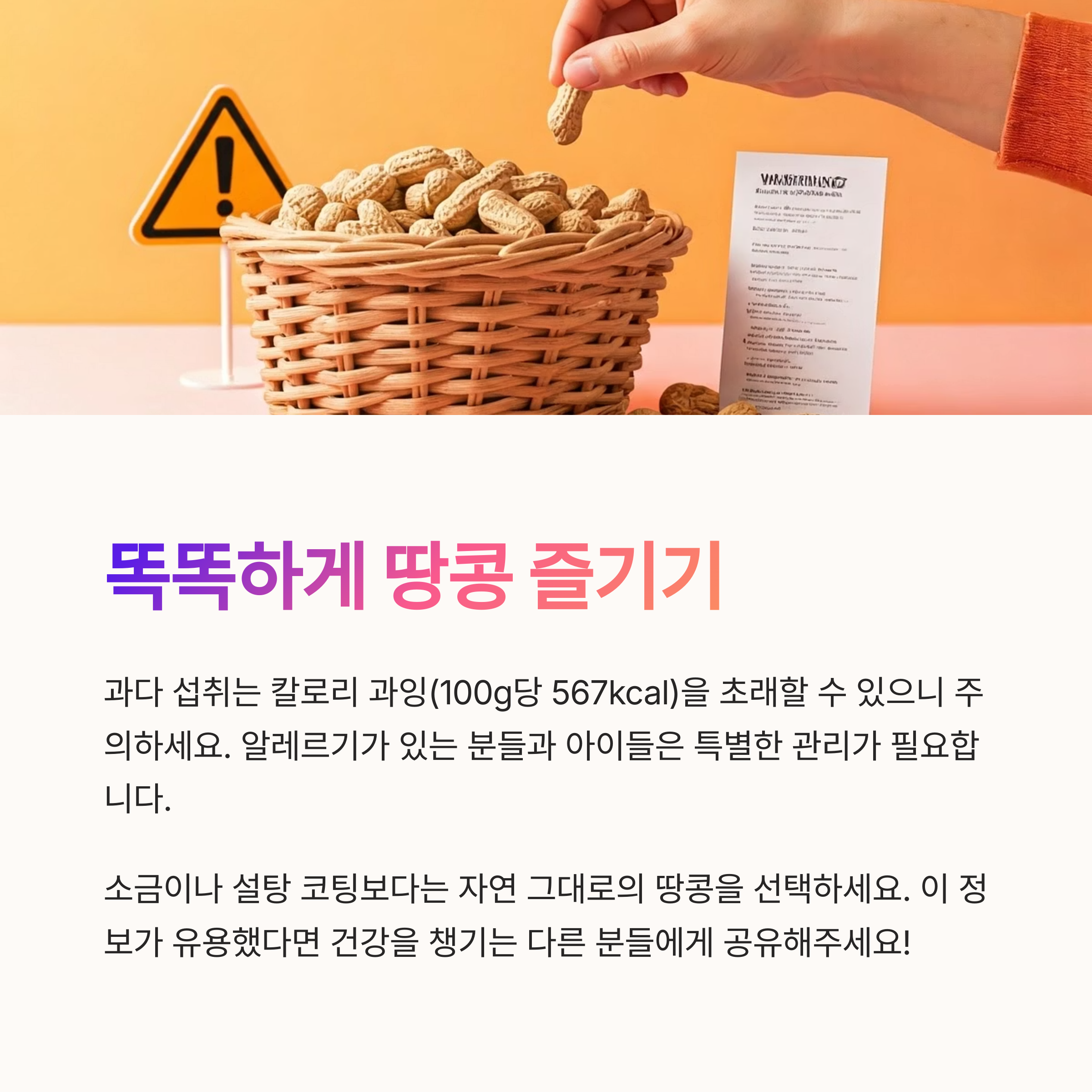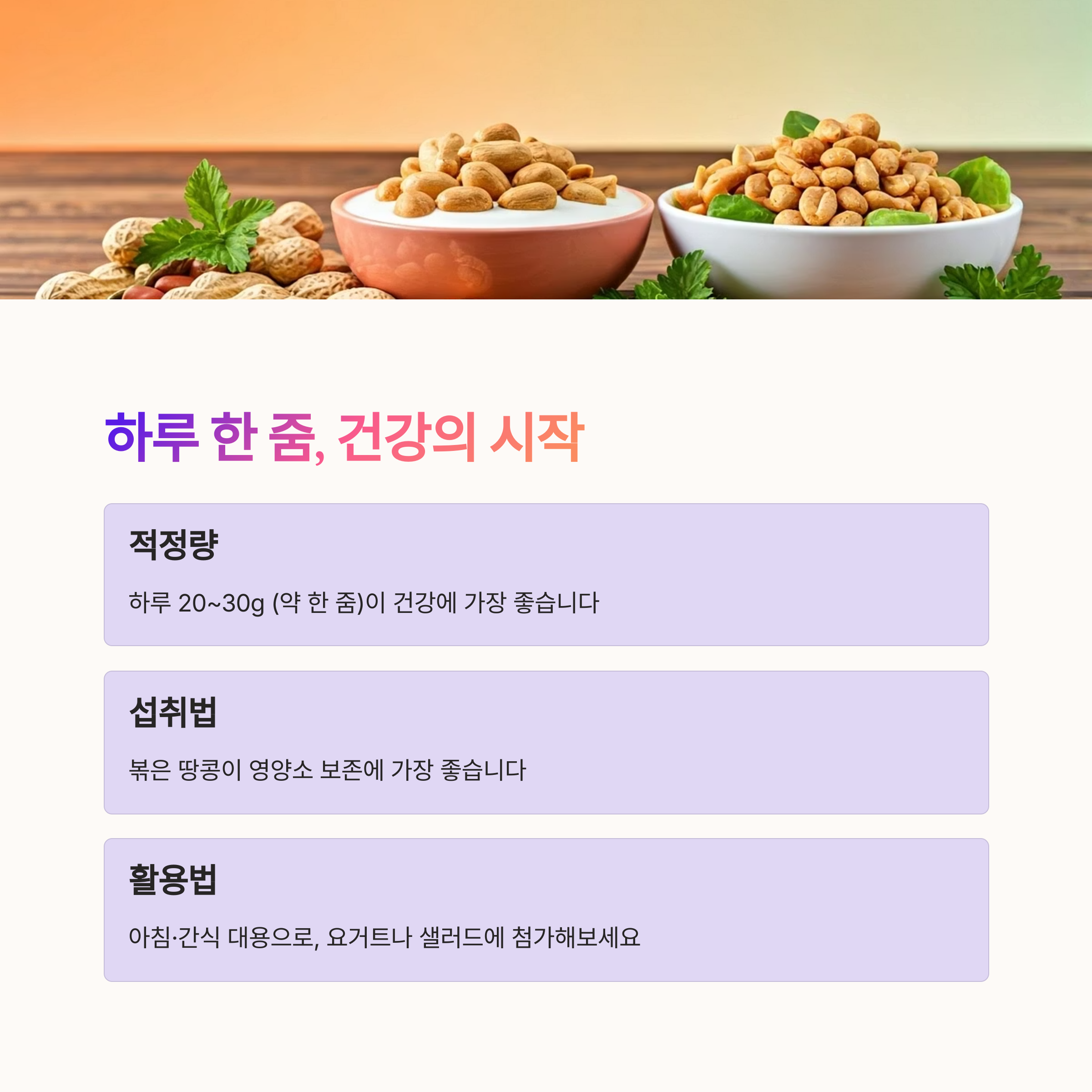| 비타민E, 단백질, 식이섬유 등 다량 함유 | 볶은 땅콩이나 무염 땅콩이 건강에 유리 | 알레르기 반응 주의, 과다 섭취 금지 |