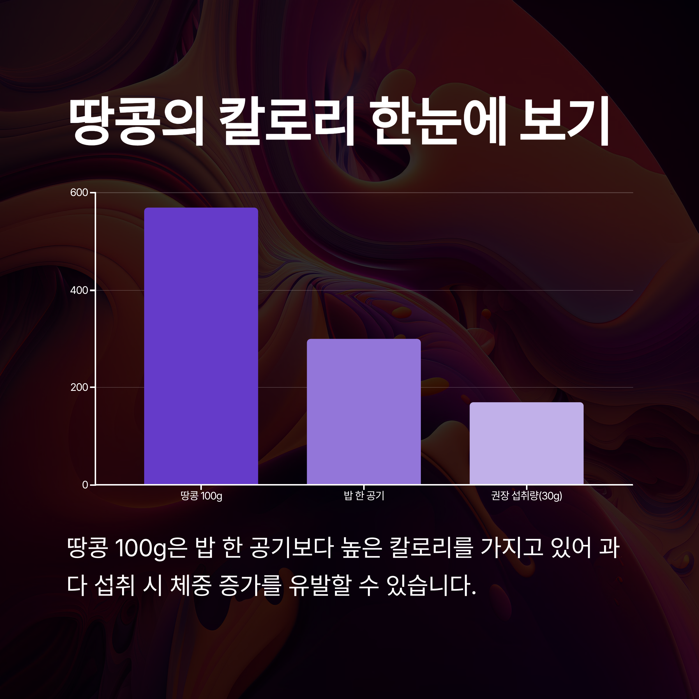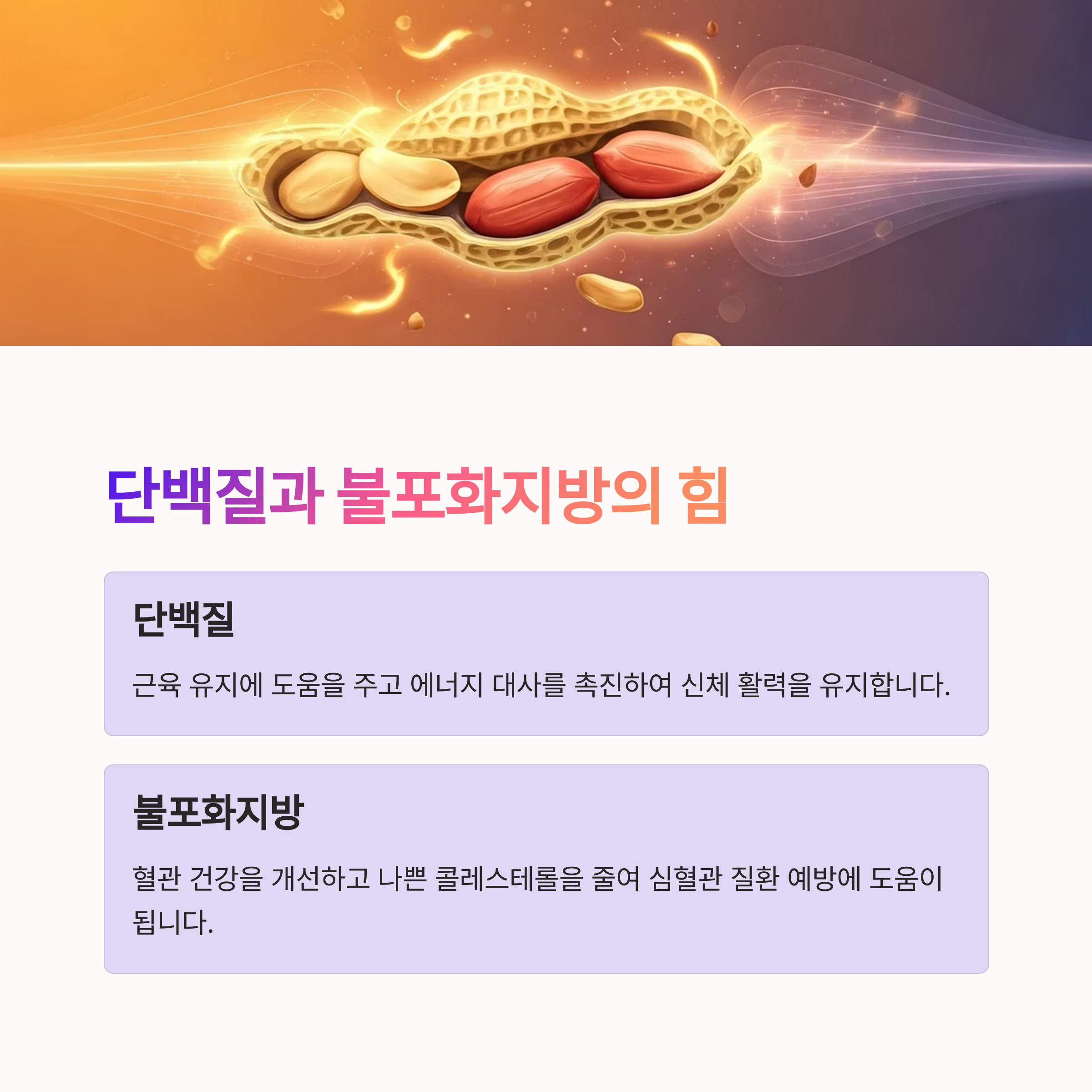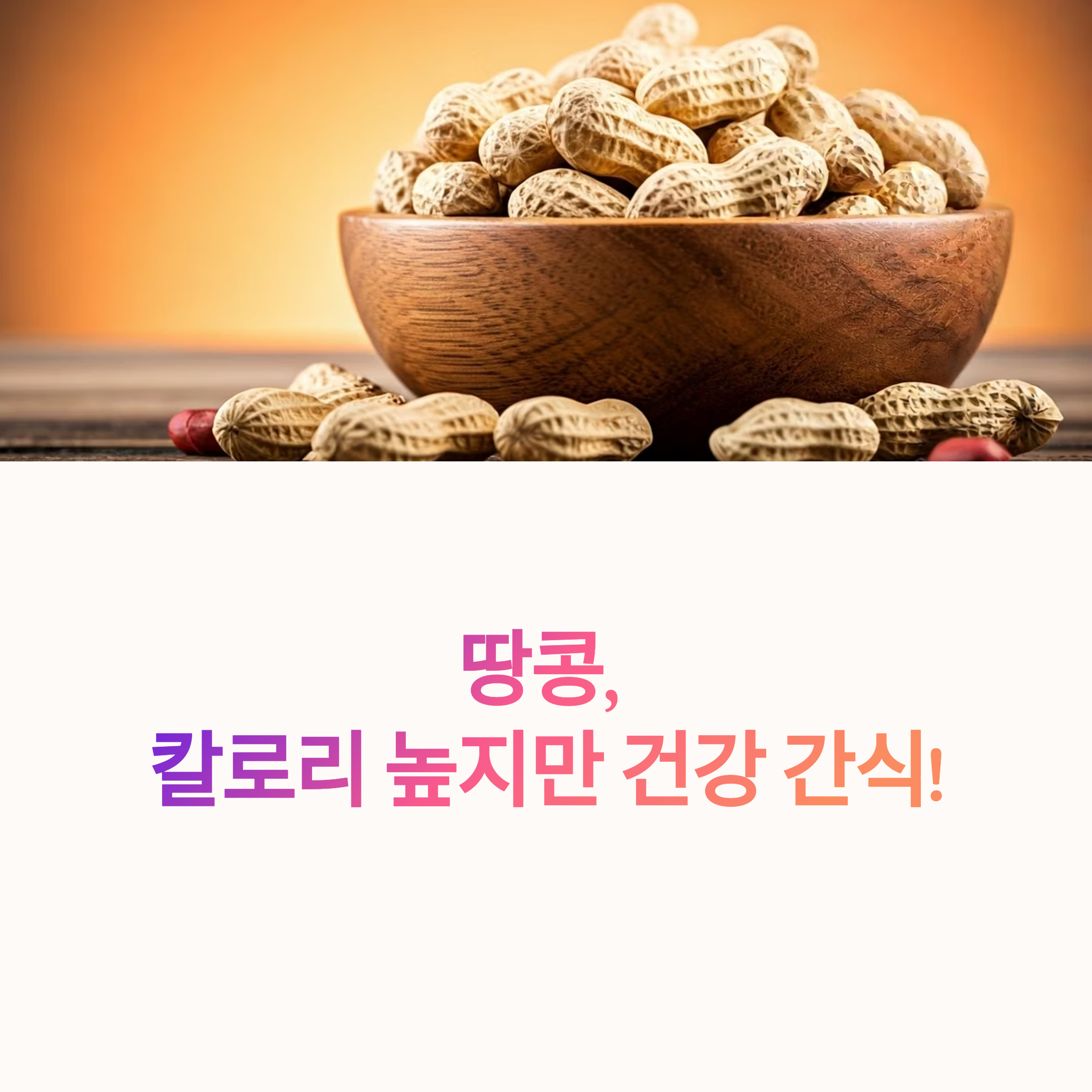 | 100g당 약 570kcal로 열량이 높은 편입니다. | 적정량 섭취 시 포만감을 높여 식욕 조절에 도움 | 조미되지 않은 구운 생땅콩이 가장 좋습니다 |