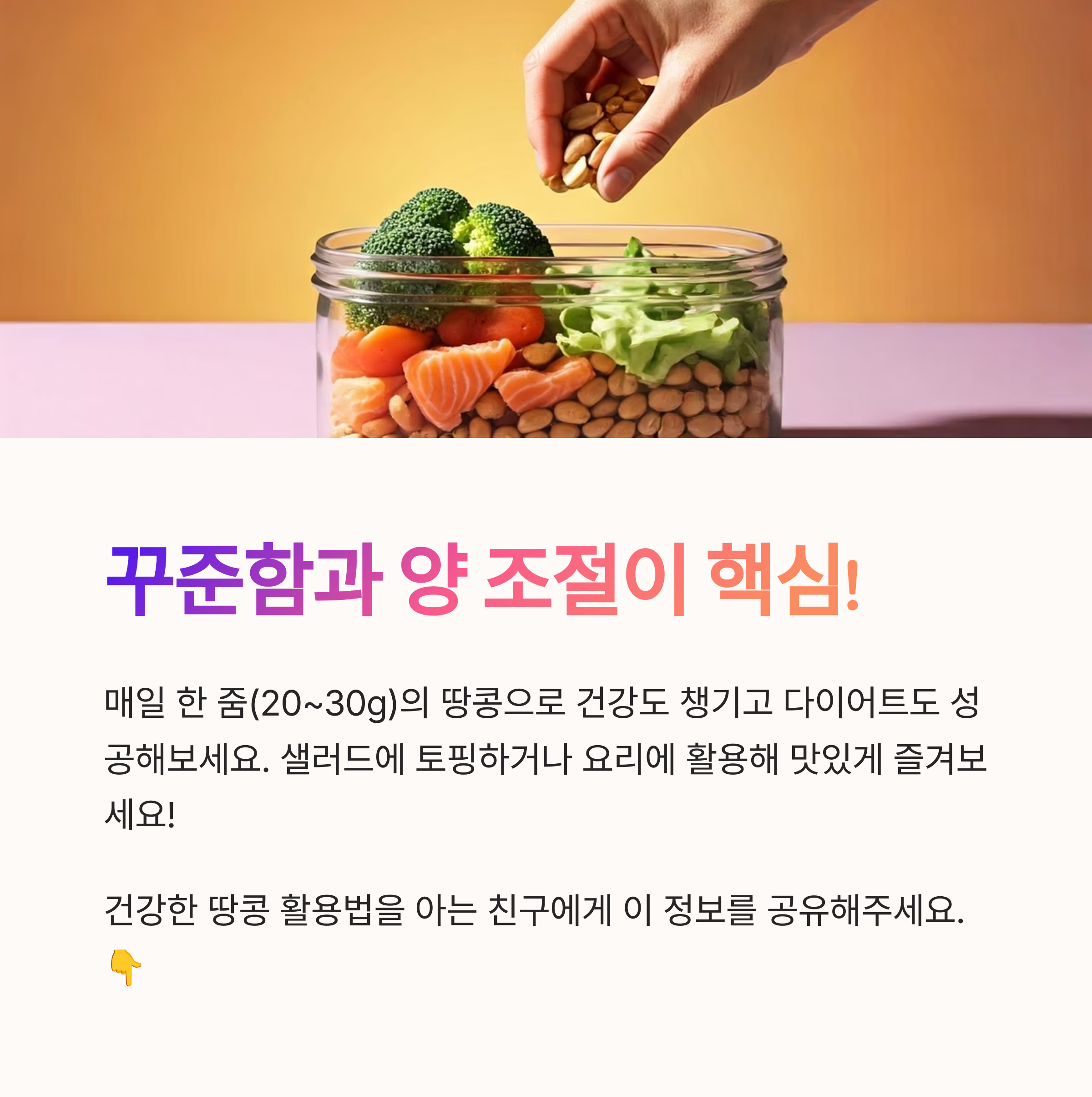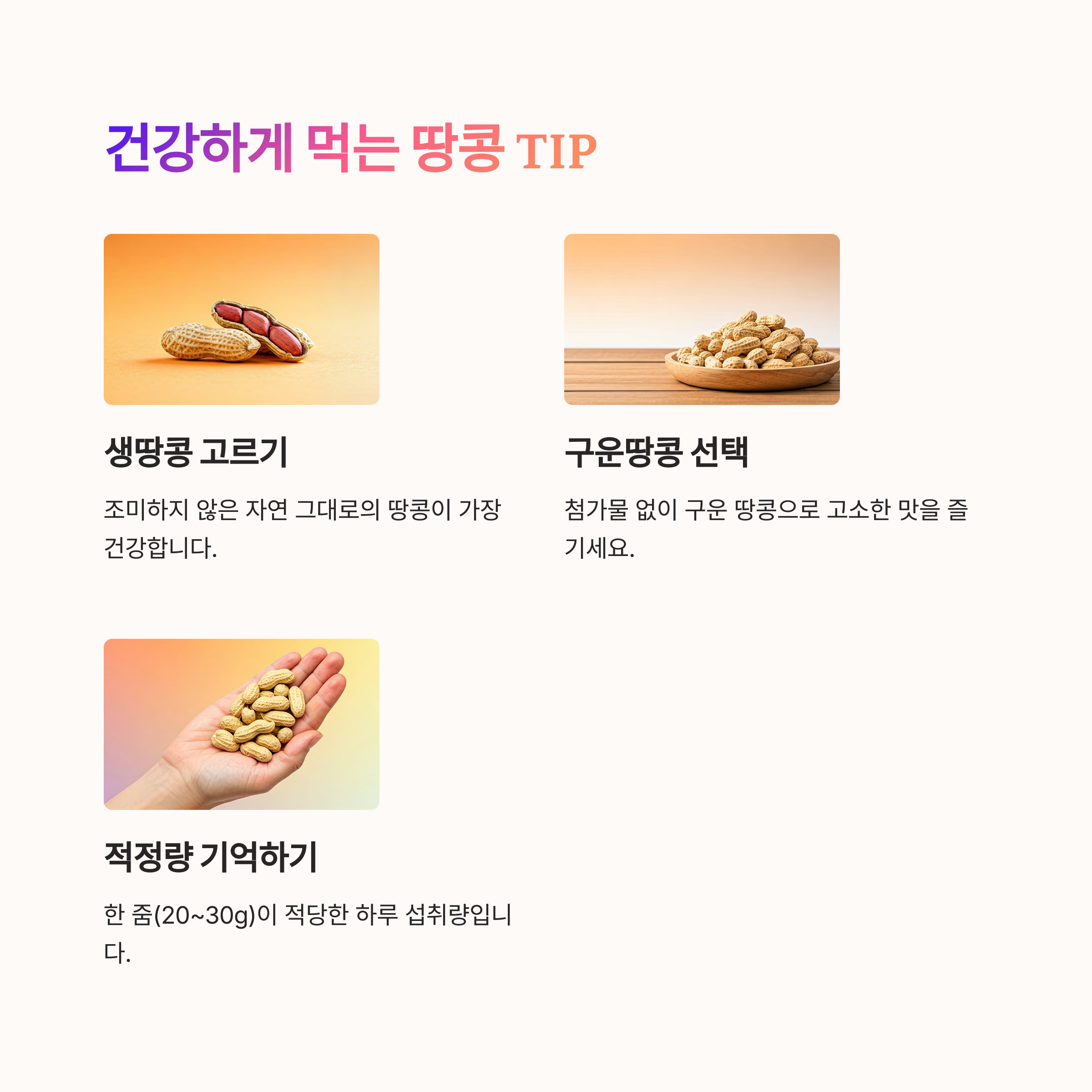 | 하루 20~30g이 적정량으로 권장됩니다 | 당류, 염분 없는 순수한 땅콩 섭취가 중요 | 온라인 마켓에서 무염 제품 쉽게 구매 가능 |