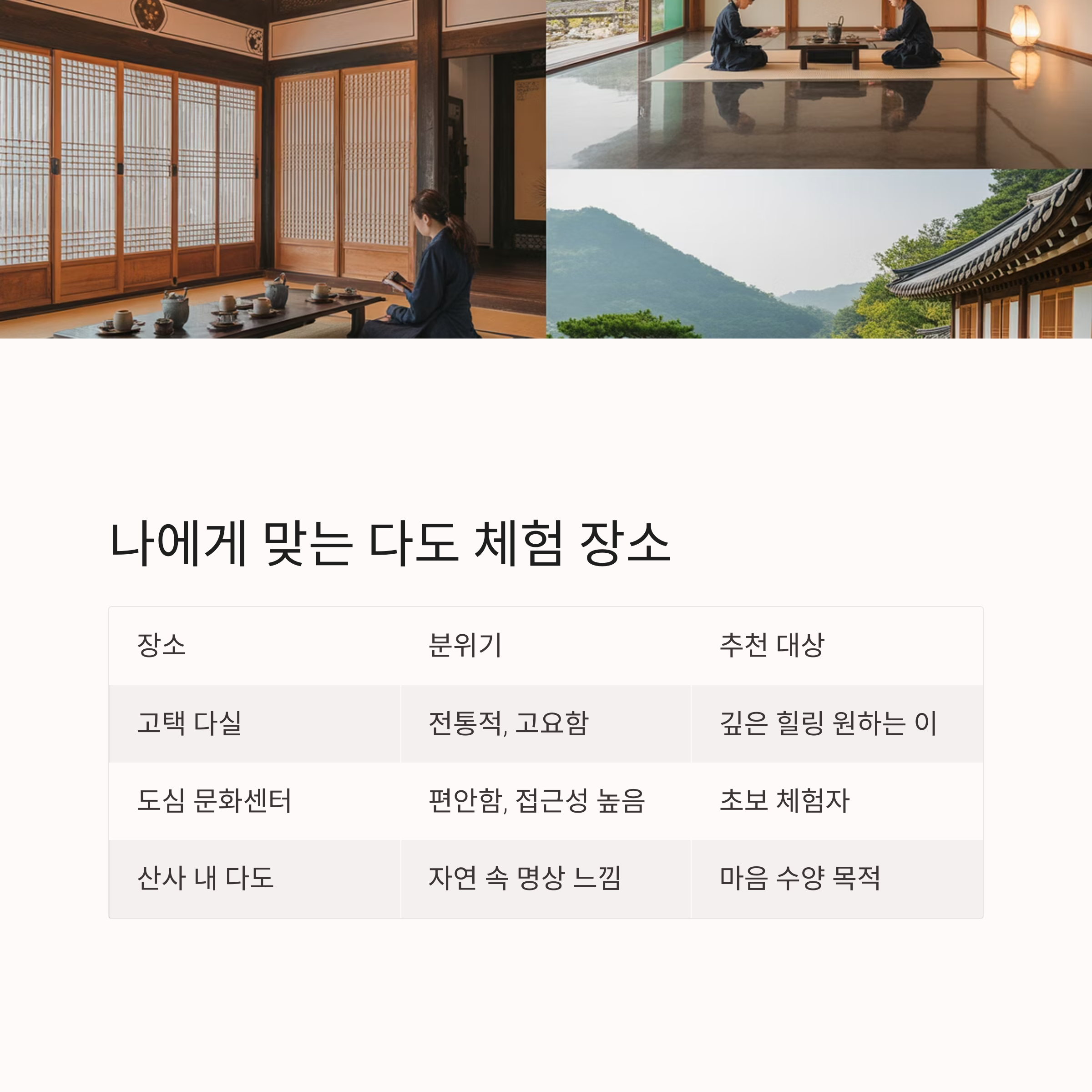 | 산사 내 다도 | 자연 속 명상 느낌 | 마음 수양 목적 |