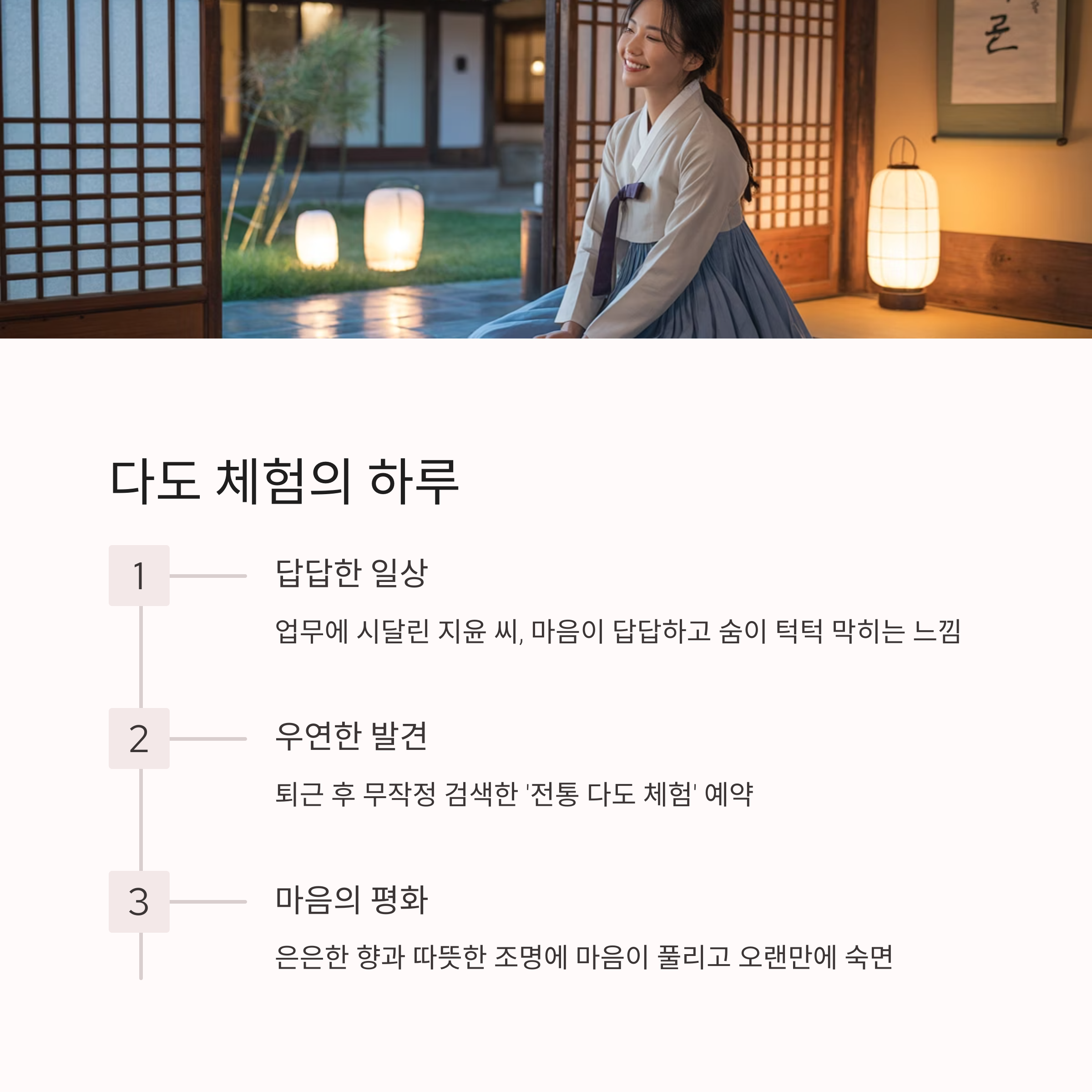 그녀는 퇴근 후 무작정 검색한 ‘전통 다도 체험’을 예약했다.