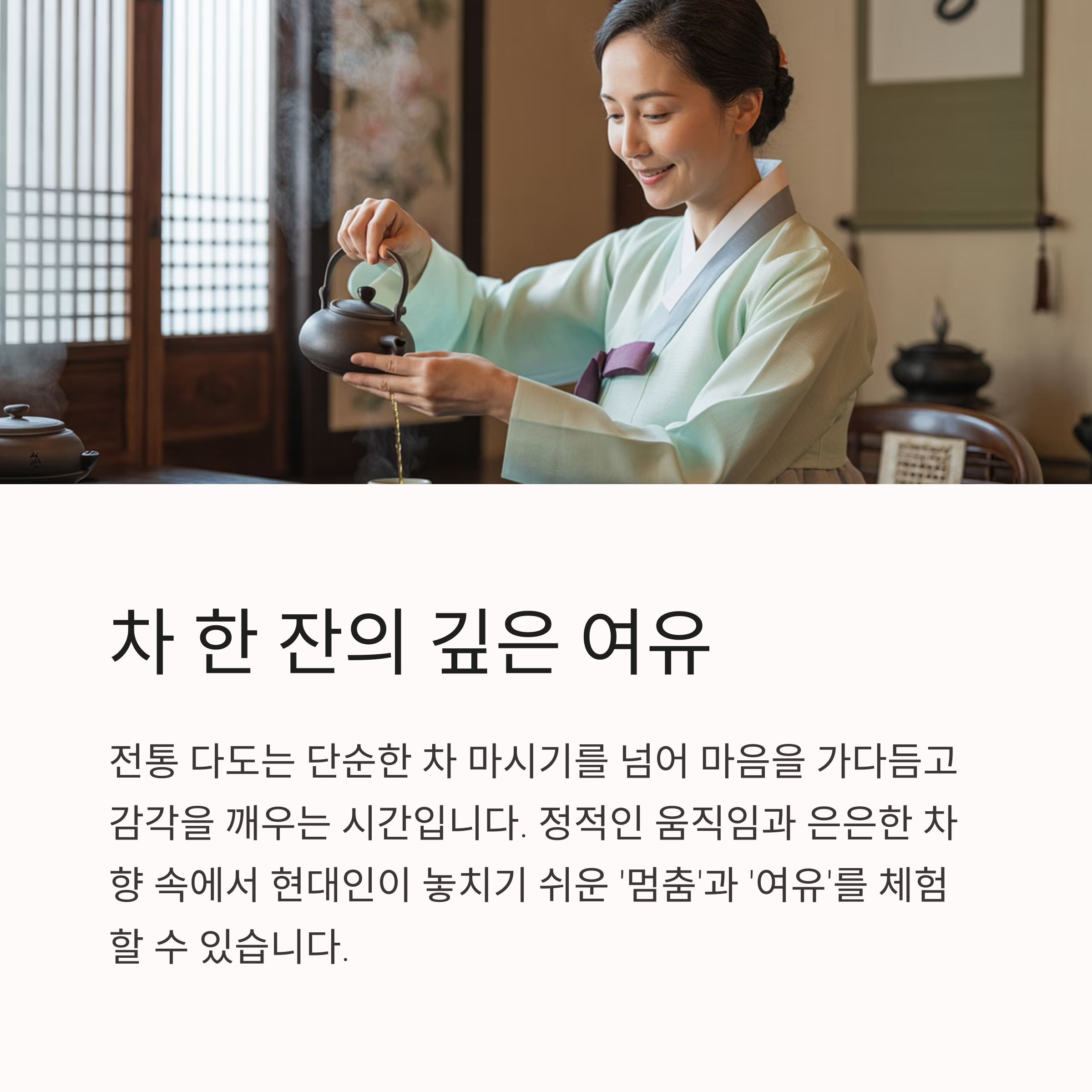 정적인 움직임과 은은한 차 향 속에서 현대인이 놓치기 쉬운 ‘멈춤’과 ‘여유’를 체험할 수 있습니다.