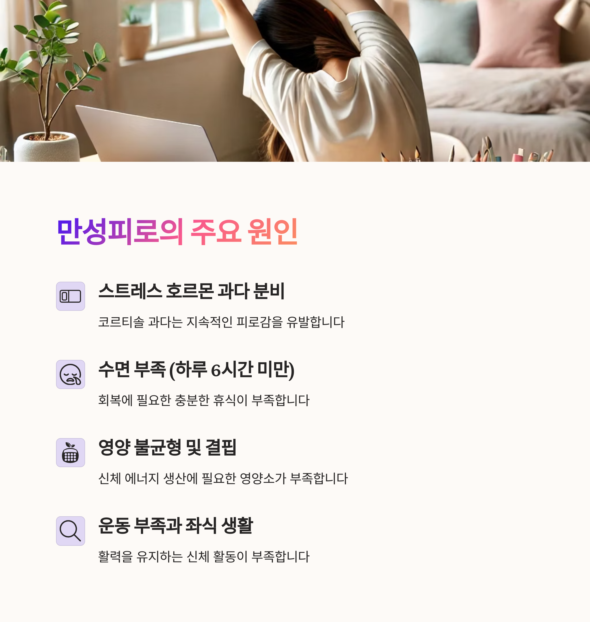 | 만성피로 원인 | 스트레스, 영양 불균형, 수면의 질 저하 등 다양함 |