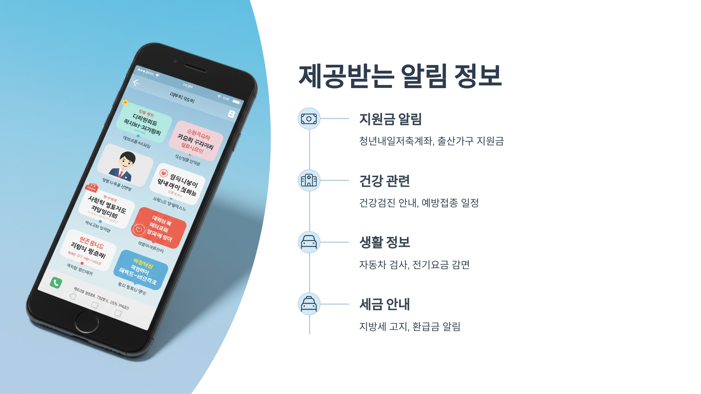 해당되는 정책과 지원금, 민원 일정 등을 자동으로 분석해 알림으로 보내줍니다.