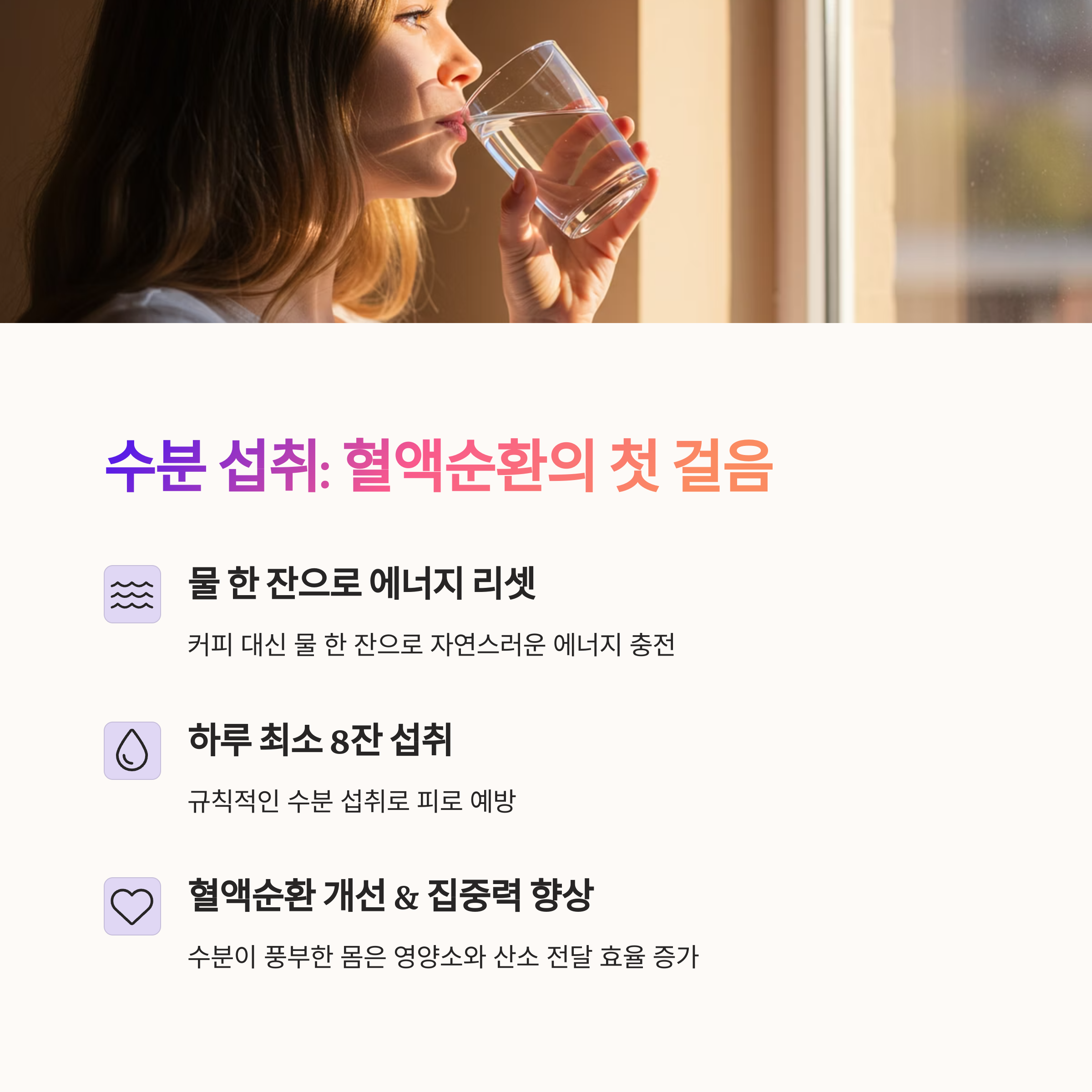 | 수분 부족, 순환 저하, 장시간 자세 유지 | 물 마시기, 스트레칭, 깊은 호흡 | 피로가 느껴지는 즉시, 매 시간마다 |