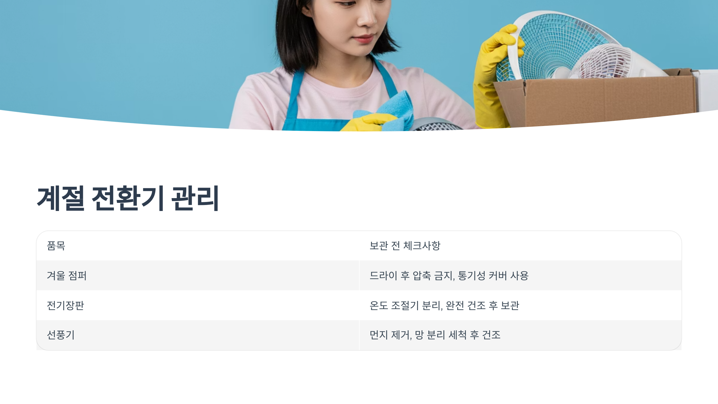 의류, 침구, 전기기기 등 계절용품을 정리하면서 반드시 세척과 점검을 함께 진행해야 합니다.