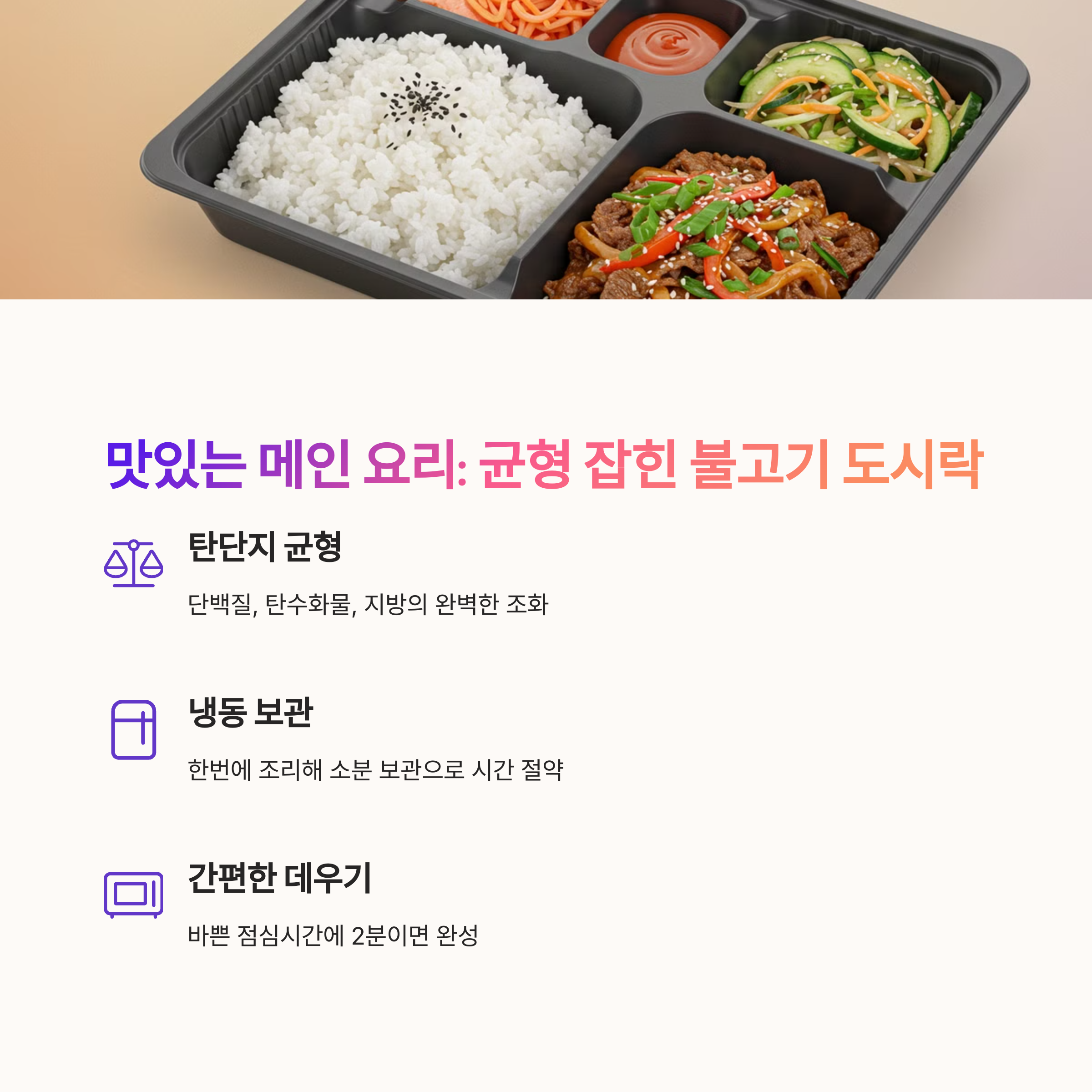 | 출근 전 빠르게 준비 가능 | 영양 부족 없이 균형 잡힌 식사 제공 | 건강과 만족도를 동시에 잡는 구성 |