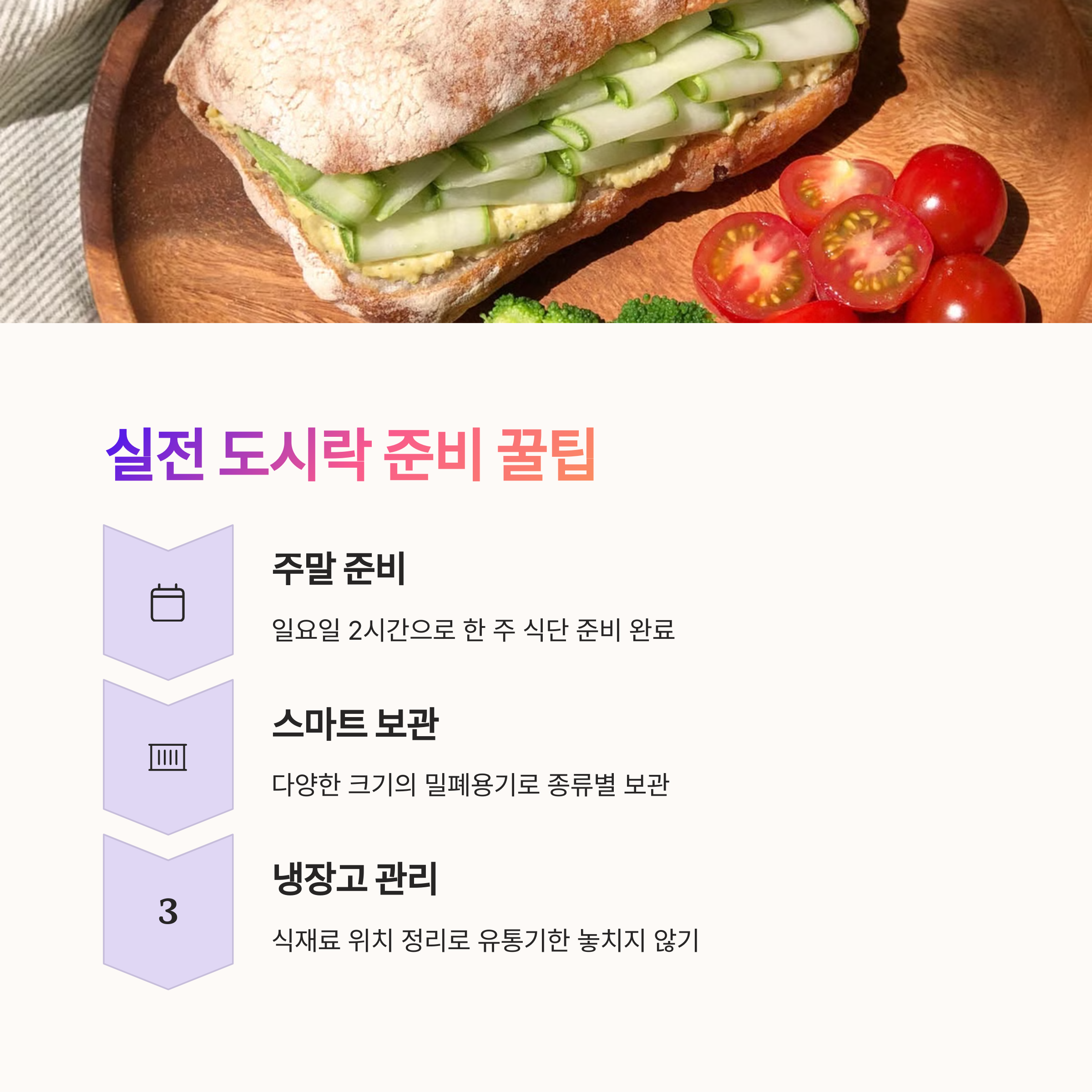 | 15분 내외로 만들 수 있는 실속 레시피 | 탄수화물, 단백질, 채소가 고루 포함된 구성 | 직장 내에서 간편하게 즐길 수 있는 도시락 |