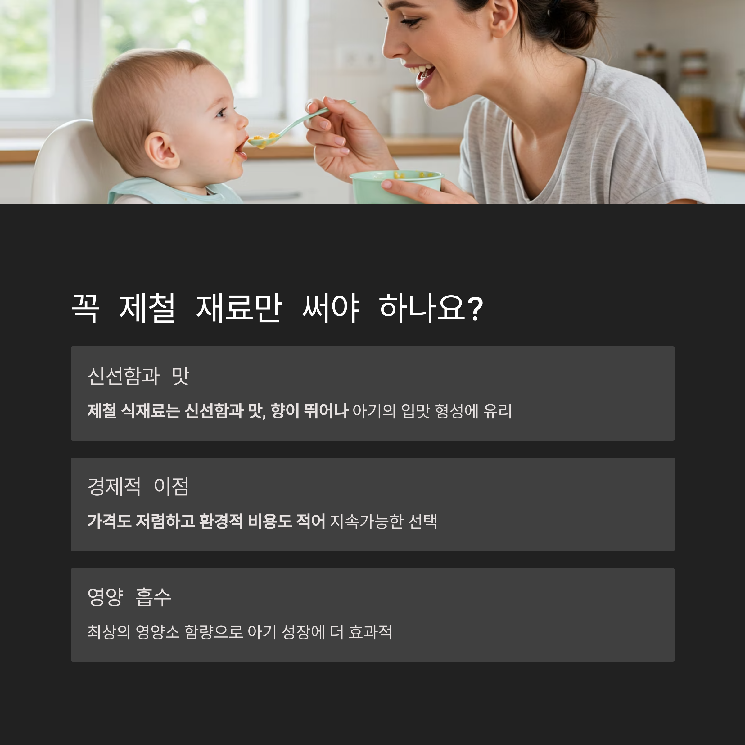 냉동 보관 없이 당일 조리로 신선한 이유식을 만들 수 있습니다.