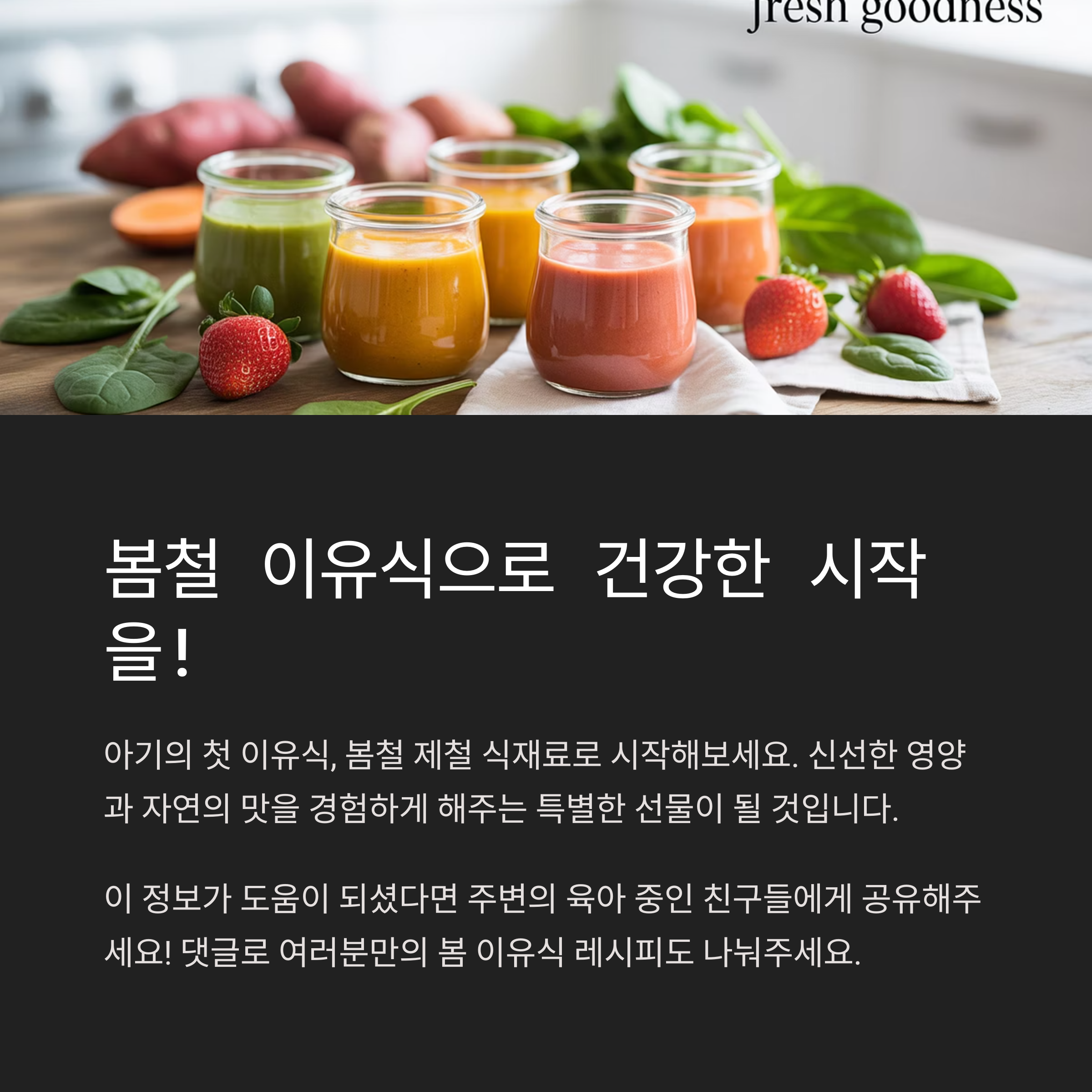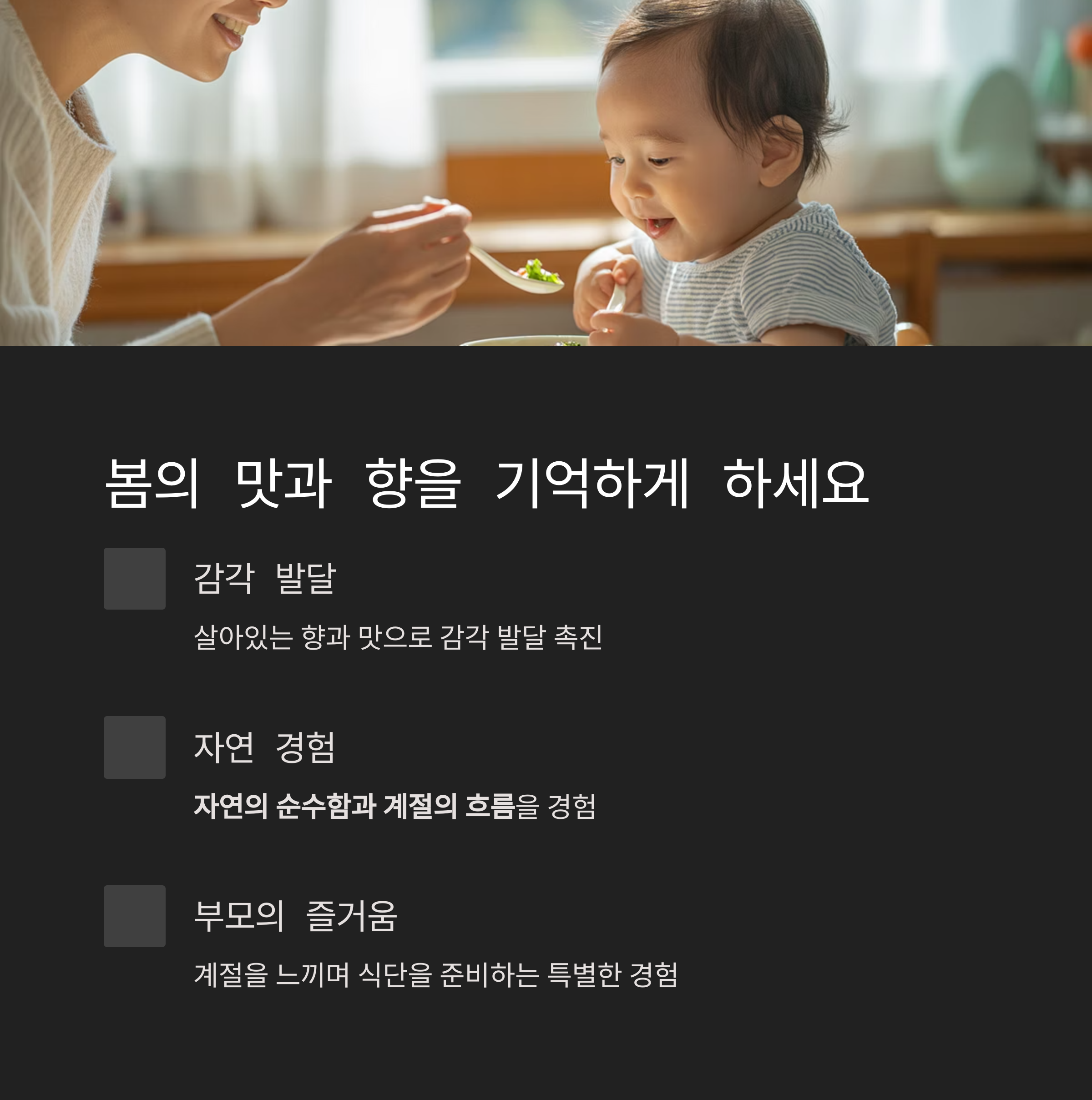 봄의 이유식은 단순한 식사가 아니라, 성장의 첫 기회를 의미합니다.