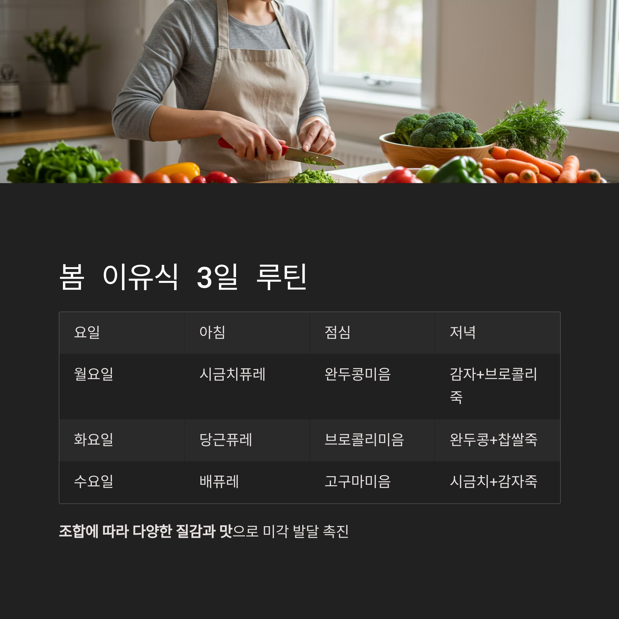 이번 글에서는 봄철 제철 식재료를 활용한 이유식 구성 방법과