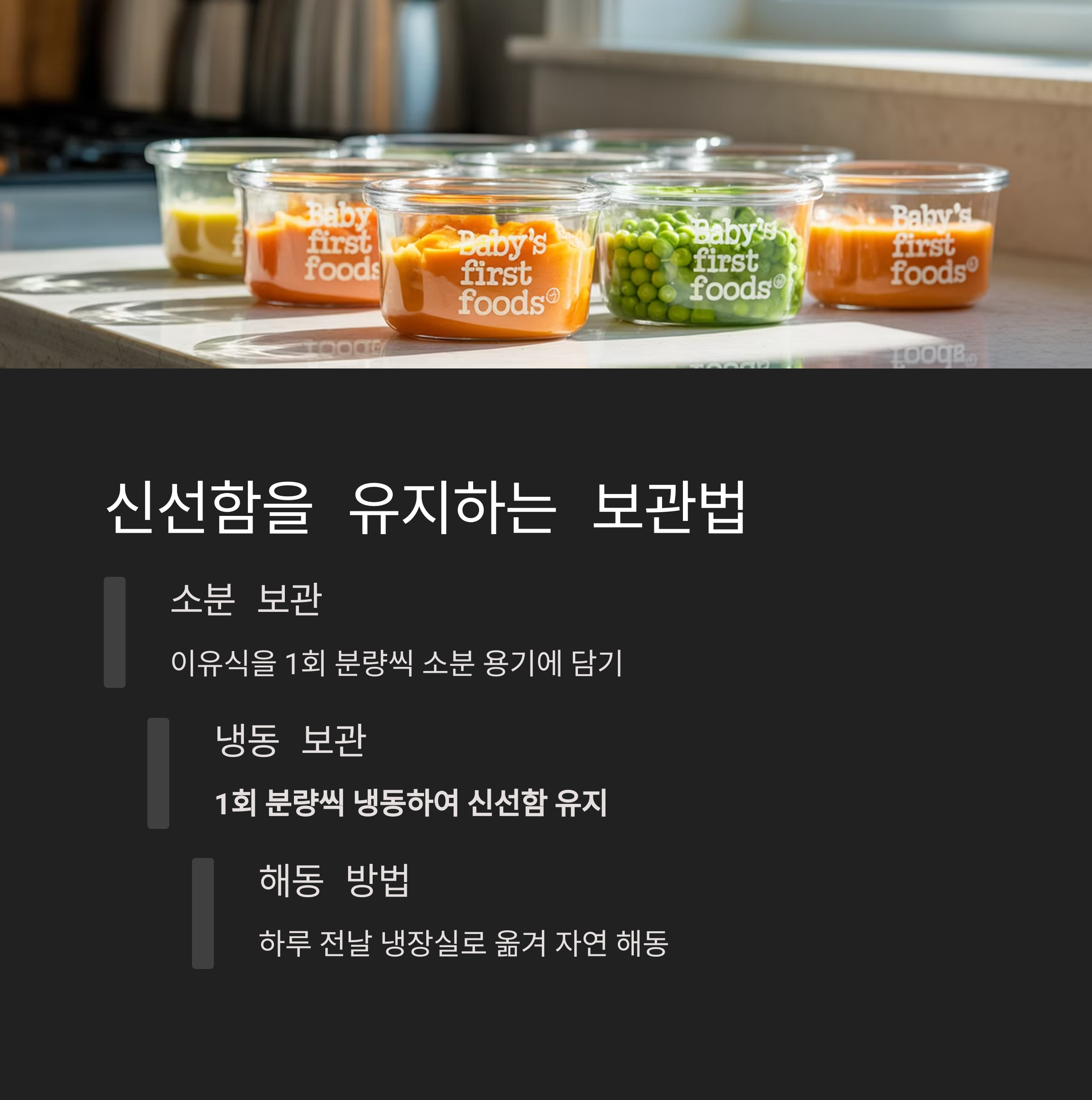 이유식으로 조리한 후에는 1회 분량씩 냉동하여 사용하는 것이 가장 좋습니다.