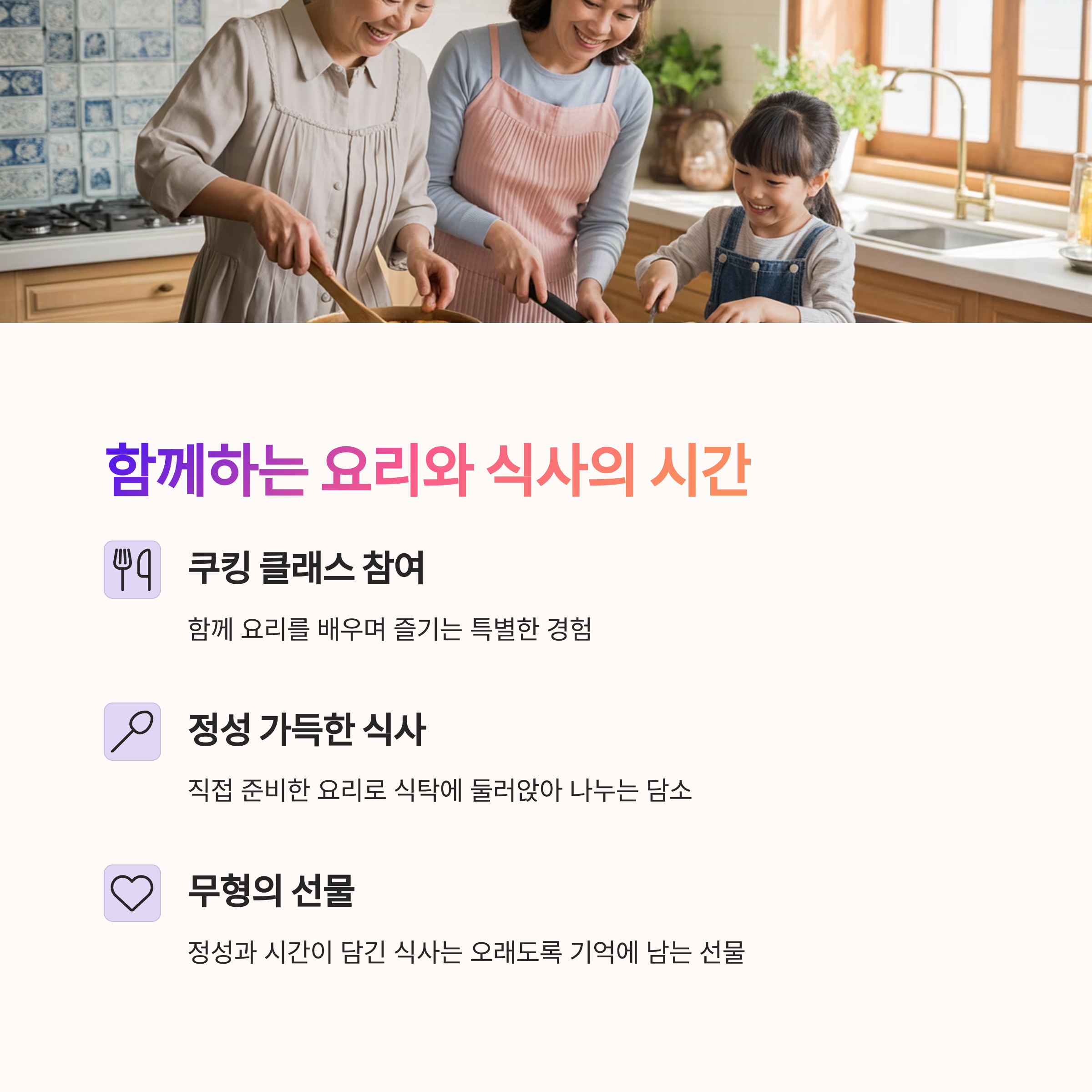 두 번째는 함께하는 요리 클래스 또는 가족 식사입니다. 요즘은 쿠킹 클래스나 다이닝 키트도 다양하게 준비되어 있어 특별한 외식보다 더욱 의미 있는 시간을 만들 수 있습니다. 또는 직접 부모님께 요리를 해드리고 식탁에 둘러앉아 담소를 나누는 것도 훌륭한 방법입니다. 정성과 시간이 담긴 식사는 무형의 선물이 되어 오랫동안 기억에 남습니다.