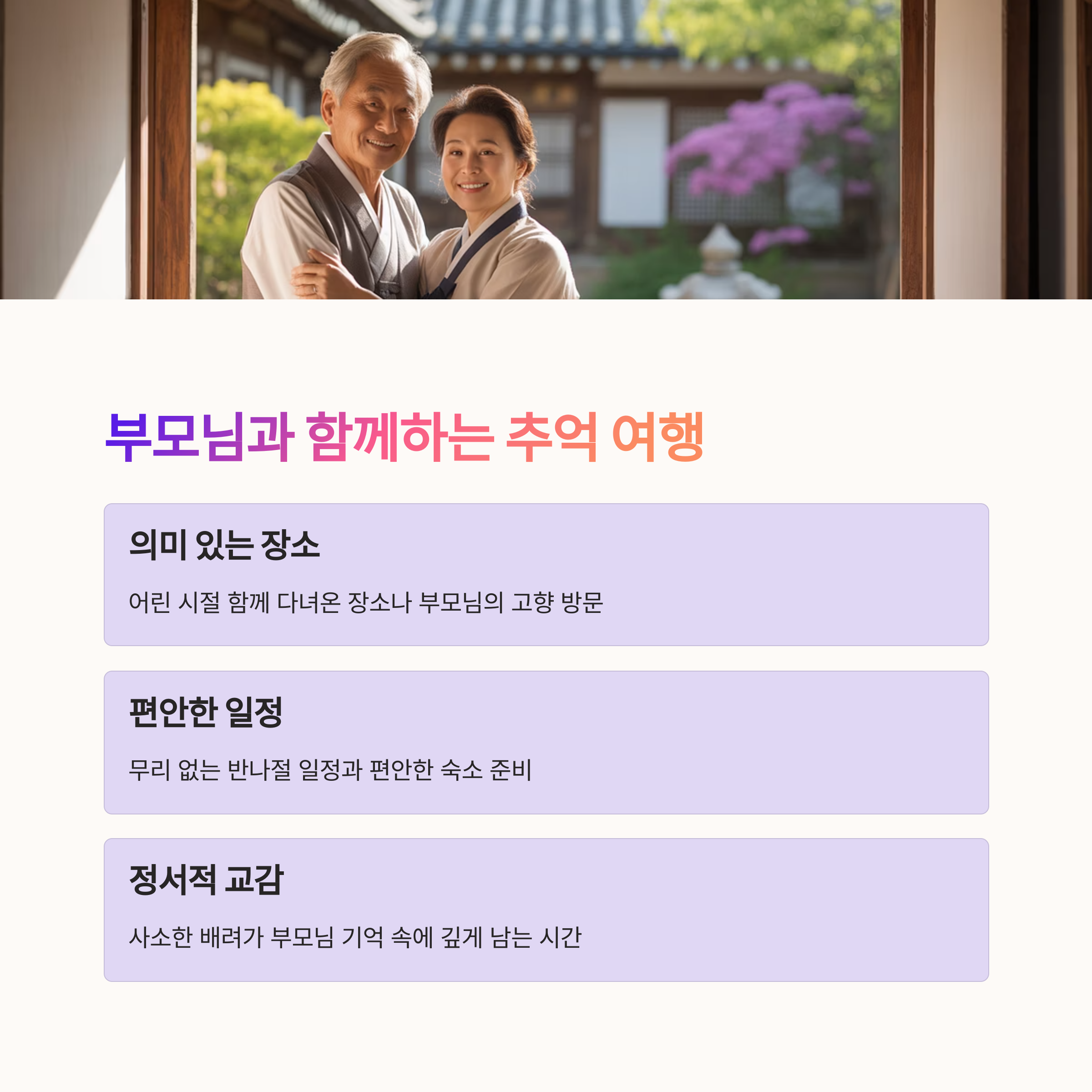 첫 번째로 추천드리는 이벤트는 부모님과의 추억 여행입니다. 가까운 국내 여행지를 하루 일정으로 다녀오는 것만으로도 부모님께는 큰 감동이 될 수 있습니다. 특히 어린 시절 함께 다녀온 장소나 부모님의 고향을 다시 찾아보는 방식은 감정을 자극하는 특별한 시간이 됩니다. 여행을 계획할 때는 무리 없는 일정과 편안한 숙소를 고려하는 것이 중요합니다. 사소한 배려 하나하나가 부모님의 기억 속에 깊게 남을 것입니다.