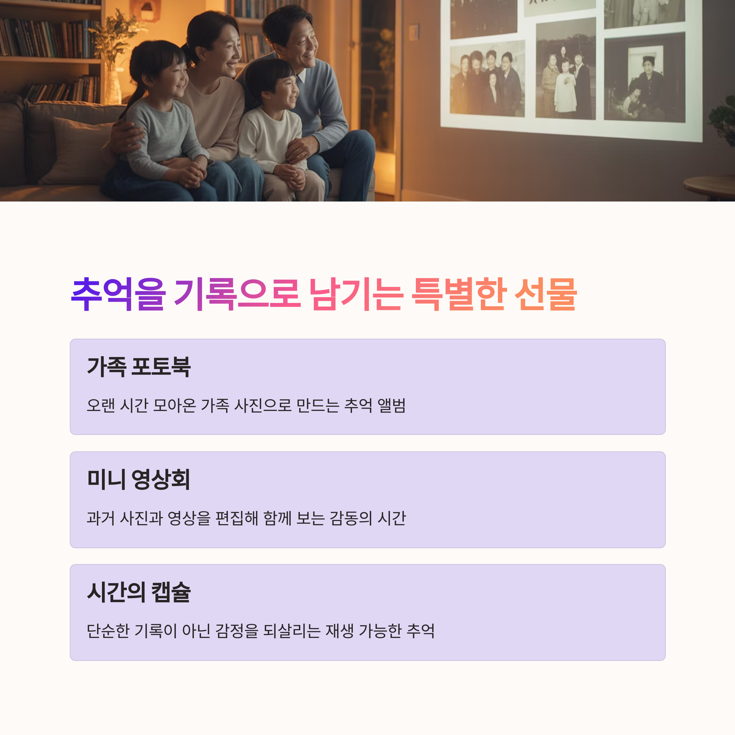 마지막으로 추천하는 이벤트는 추억을 기록으로 남기는 활동입니다. 가족 포토북을 제작하거나 동영상을 편집해 과거 사진과 함께 상영하는 미니 영상회를 준비해보세요. 기술에 익숙지 않은 부모님도 사진과 영상으로 담긴 가족의 시간에 감동할 것입니다. 단순한 기록이 아닌 감정을 되살리는 선물이 되어 다시 꺼내볼 수 있는 시간의 캡슐이 됩니다.
