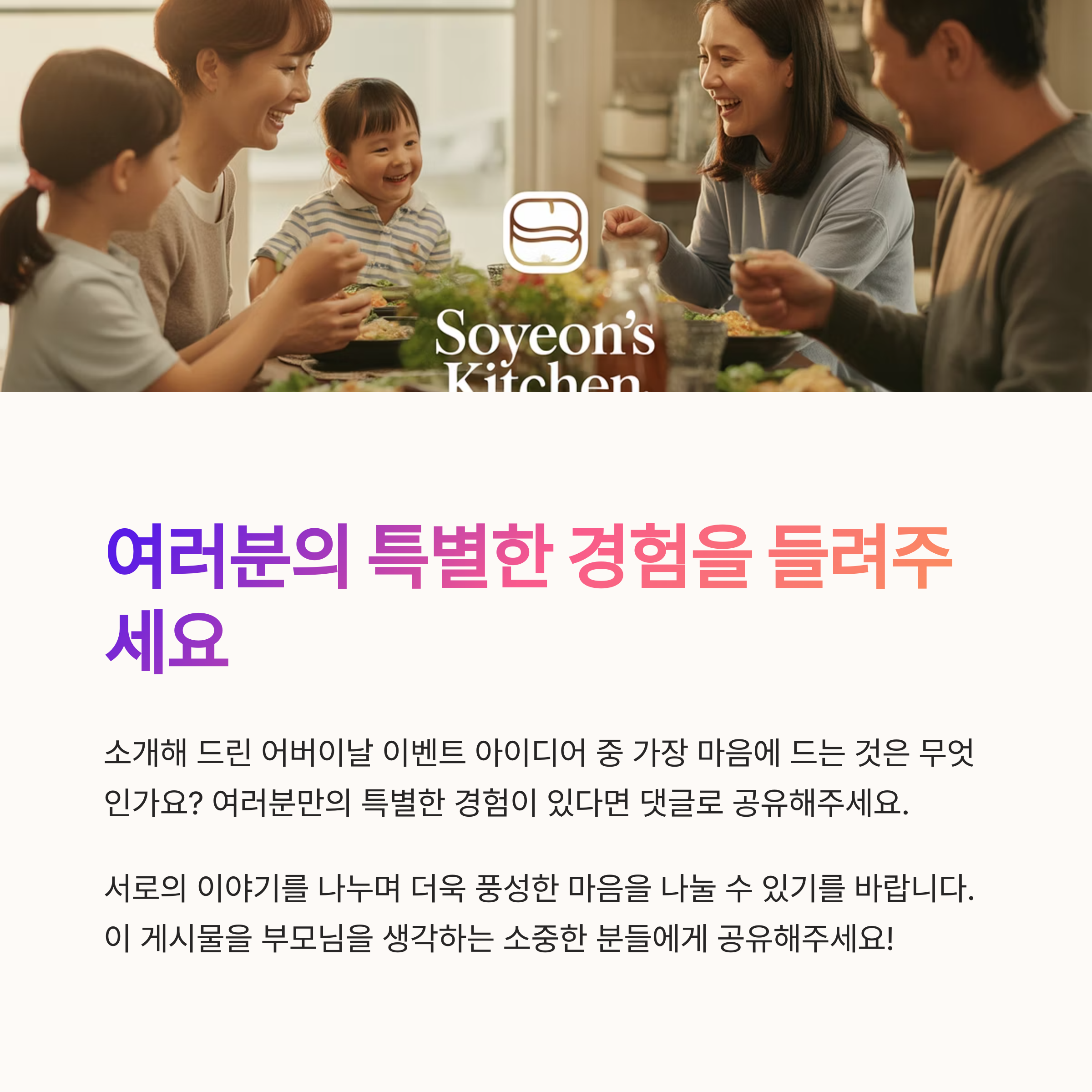 오늘 소개한 어버이날 이벤트 아이디어 중 가장 마음에 드는 것은 무엇인가요? 혹은 여러분만의 특별한 경험이 있다면 댓글로 공유해주세요. 서로의 이야기를 나누며 더욱 풍성한 마음을 나눌 수 있기를 바랍니다!