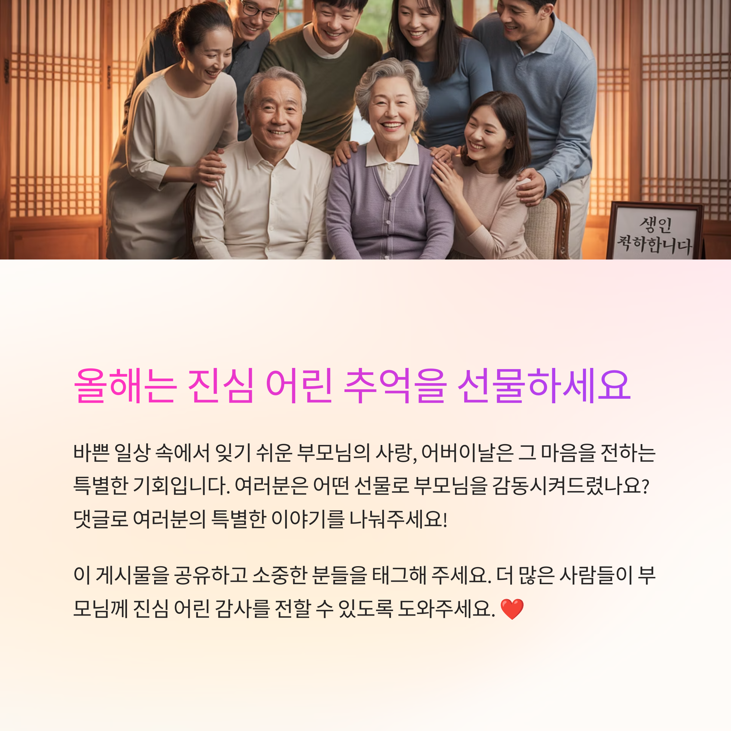 어버이날은 단지 선물을 드리는 날이 아니라, 마음을 전하는 특별한 기회입니다. 우리는 바쁜 일상 속에서 부모님의 사랑에 무뎌지기도 합니다. 하지만 진심 어린 한 마디, 사진 한 장, 영상 한 편이 부모님께는 무엇과도 바꿀 수 없는 감동이 됩니다. 올해 어버이날에는 상자 속 물건보다 마음 속 추억을 선물해보세요. 그 따뜻한 순간은 오래도록 부모님의 기억에 남아 삶의 큰 위안이 될 것입니다.