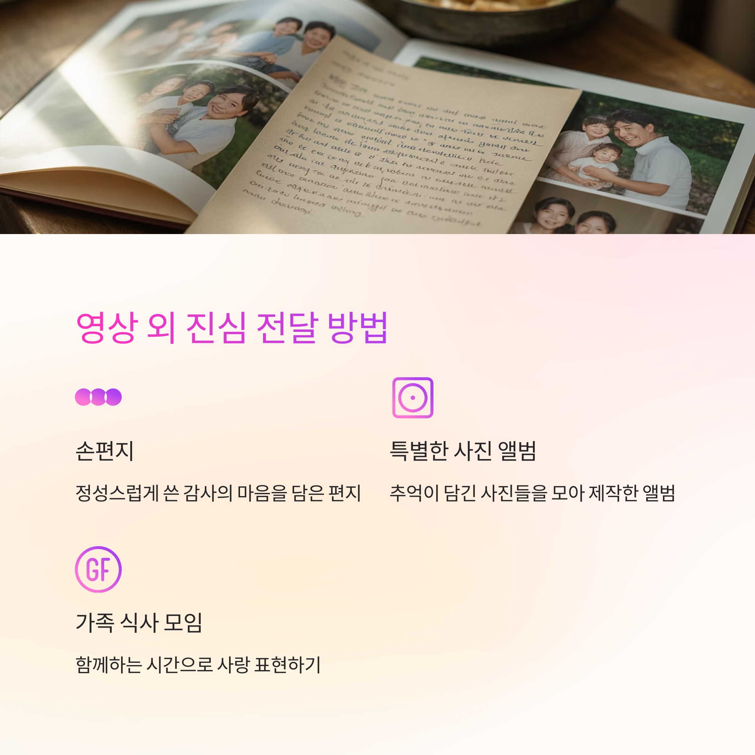 실용적인 선물도 좋지만, 부모님이 진정으로 원하는 것은 가족의 사랑과 함께한 시간입니다. 최근에는 영상 외에도 손편지를 함께 전하거나, 영상을 가족 모임 시간에 함께 시청하며 감동을 나누는 방식도 인기입니다. 눈에 보이지 않는 사랑의 표현이 오래도록 기억되는 선물이 됩니다.